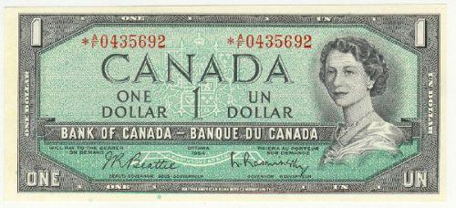 Bank of Canada; $1.00 1954 replacement, BC-37bA-i, UNC, signature; Beattie Rasminsky, serial; *A/F0435692.