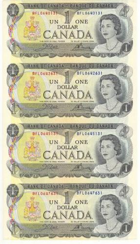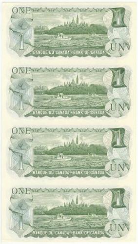Bank of Canada; $1.00 1973 mini sheet of 4 vertical notes, BC-46b, UNC, signature; Crow Bouey, serial; BFL0640131-2631-5131-7631.