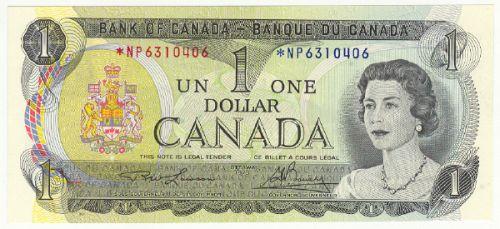 Bank of Canada; $1.00 1973 replacement, BC-46aA, UNC, signature; Lawson Bouey, serial; *NP6310406.