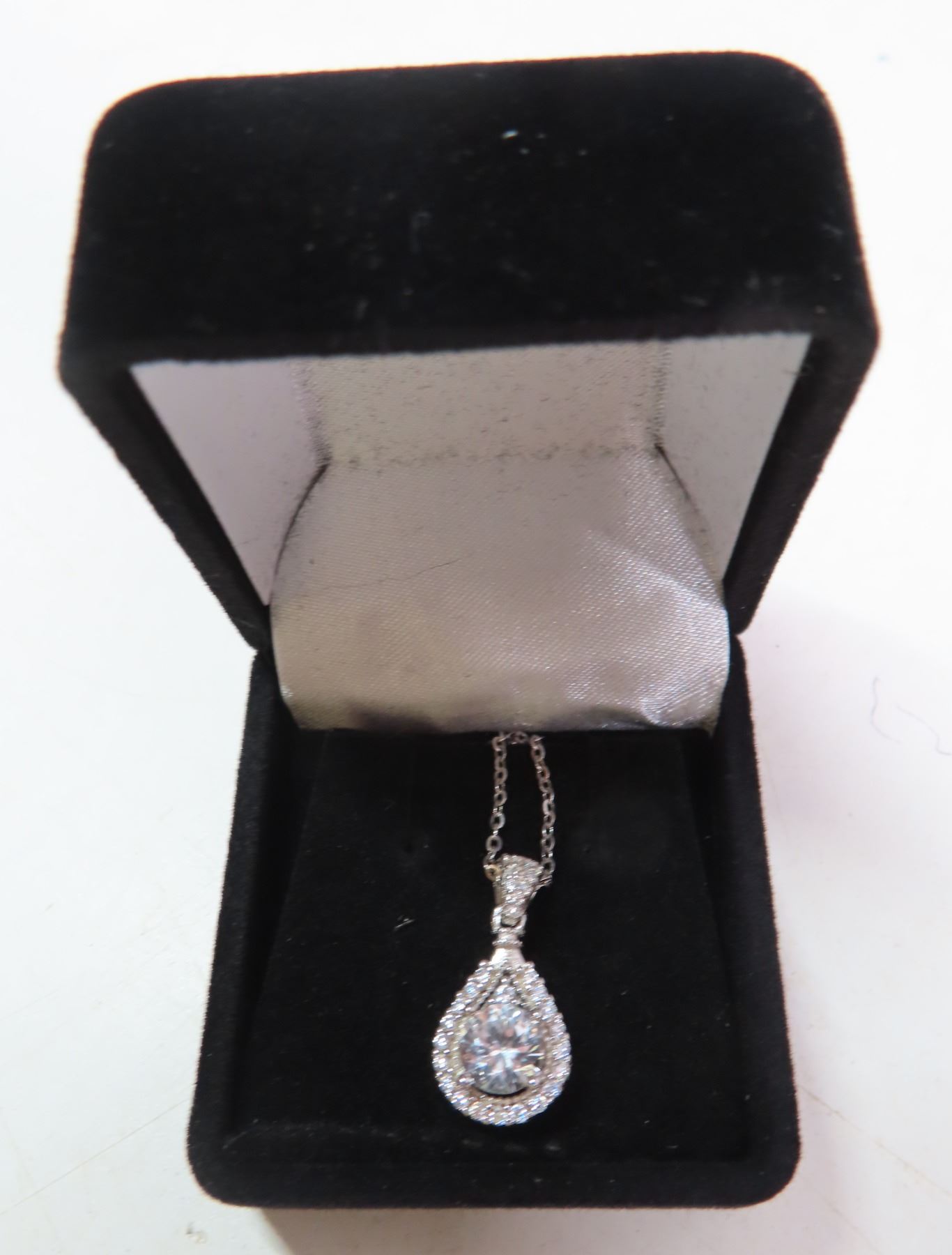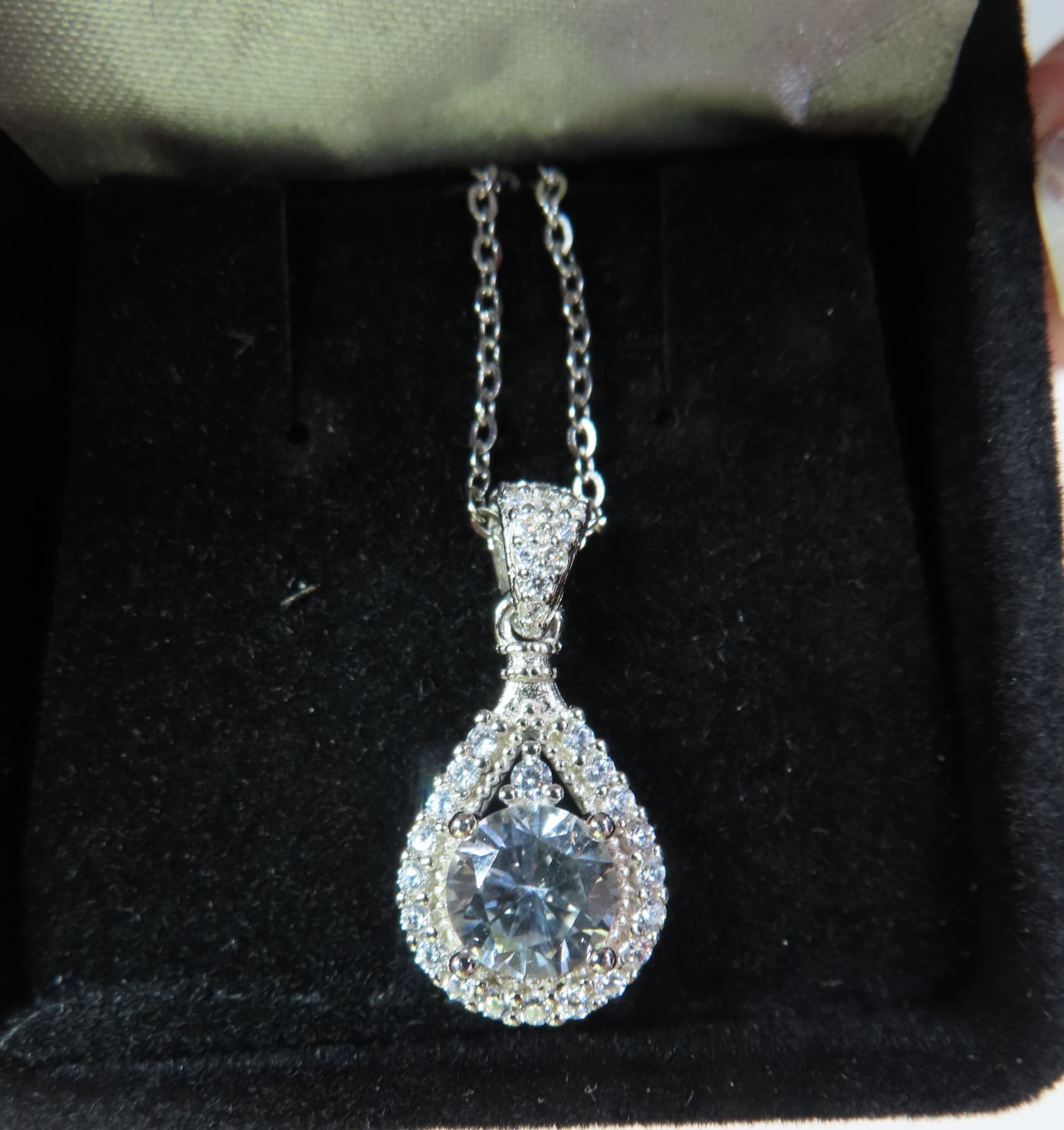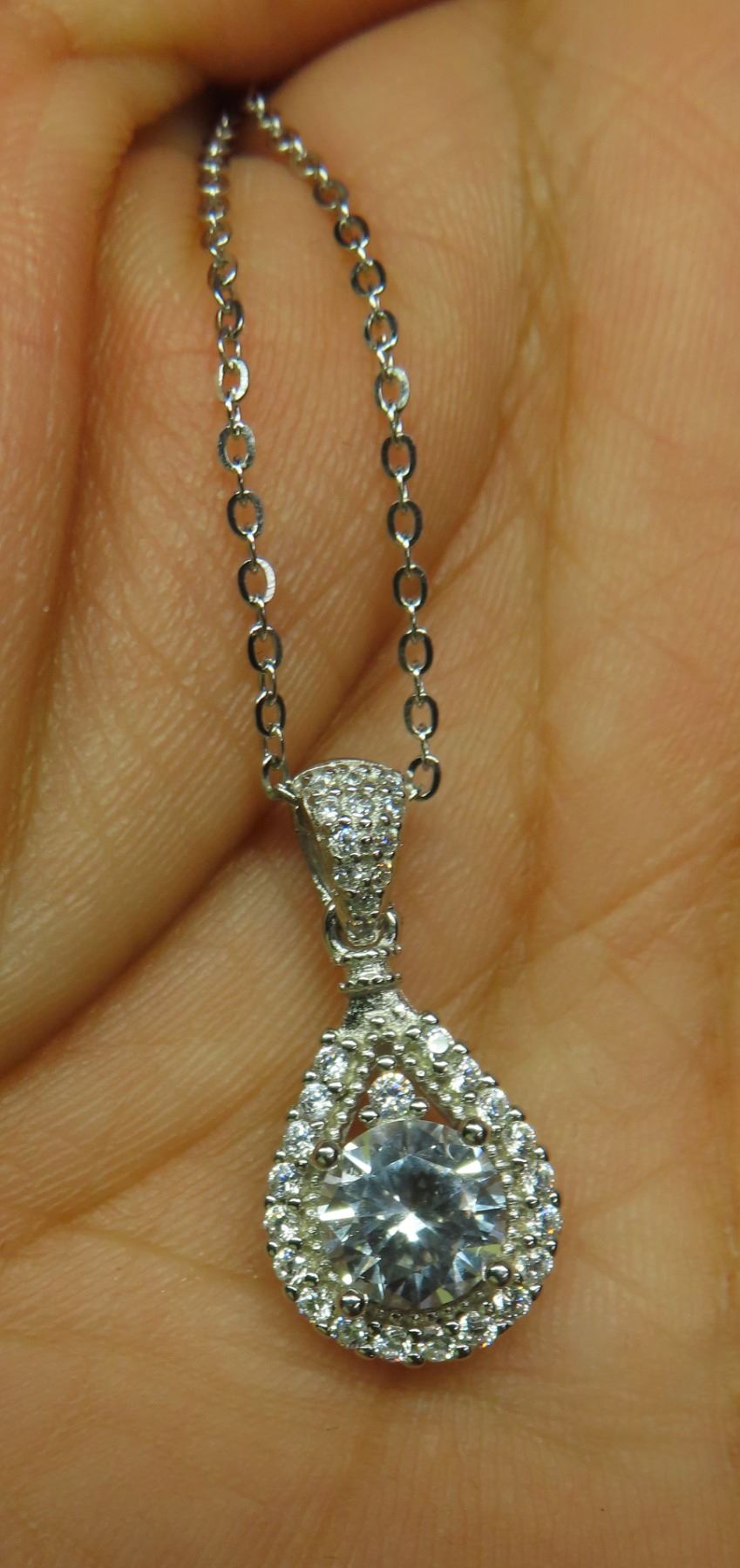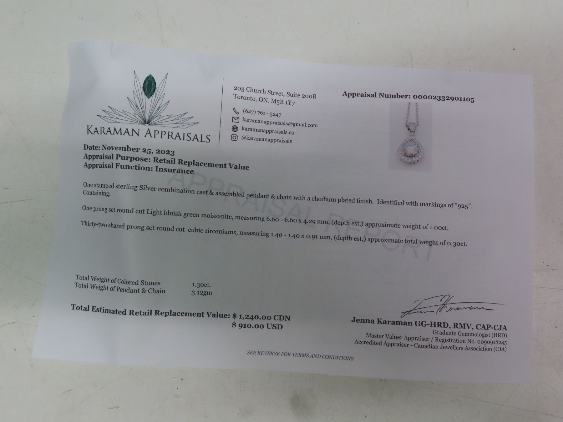1.00 CT GRA CERTIFIED MOISSANITE VVS D COLOR WITH 32 ROUND CUT CUBIC ZIRCONIUM SET IN HALO AND ON BAIL WEIGHING 0.30 CT TW SET IN STERLING SILVER PENDANT RETAIL VALUE $1,240.00-