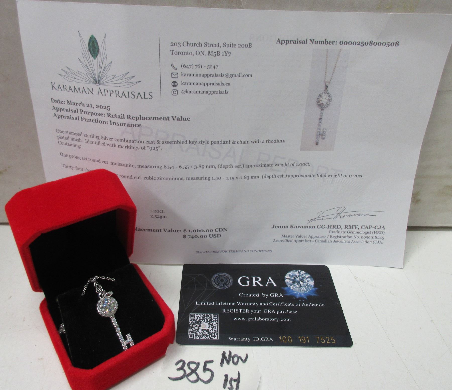 1.00 CT GRA CERTIFIED ROUND BRILLIANT CUT MOISSANITE STONE VVS D COLOR WITH 34 ROUND BRILLIANT CUT CUBIC ZIRCONIA SET IN ROUND HALO AND A KEY SHAPE SET IN 925 SILVER PENDANT RETAIL VALUE $1,060.00