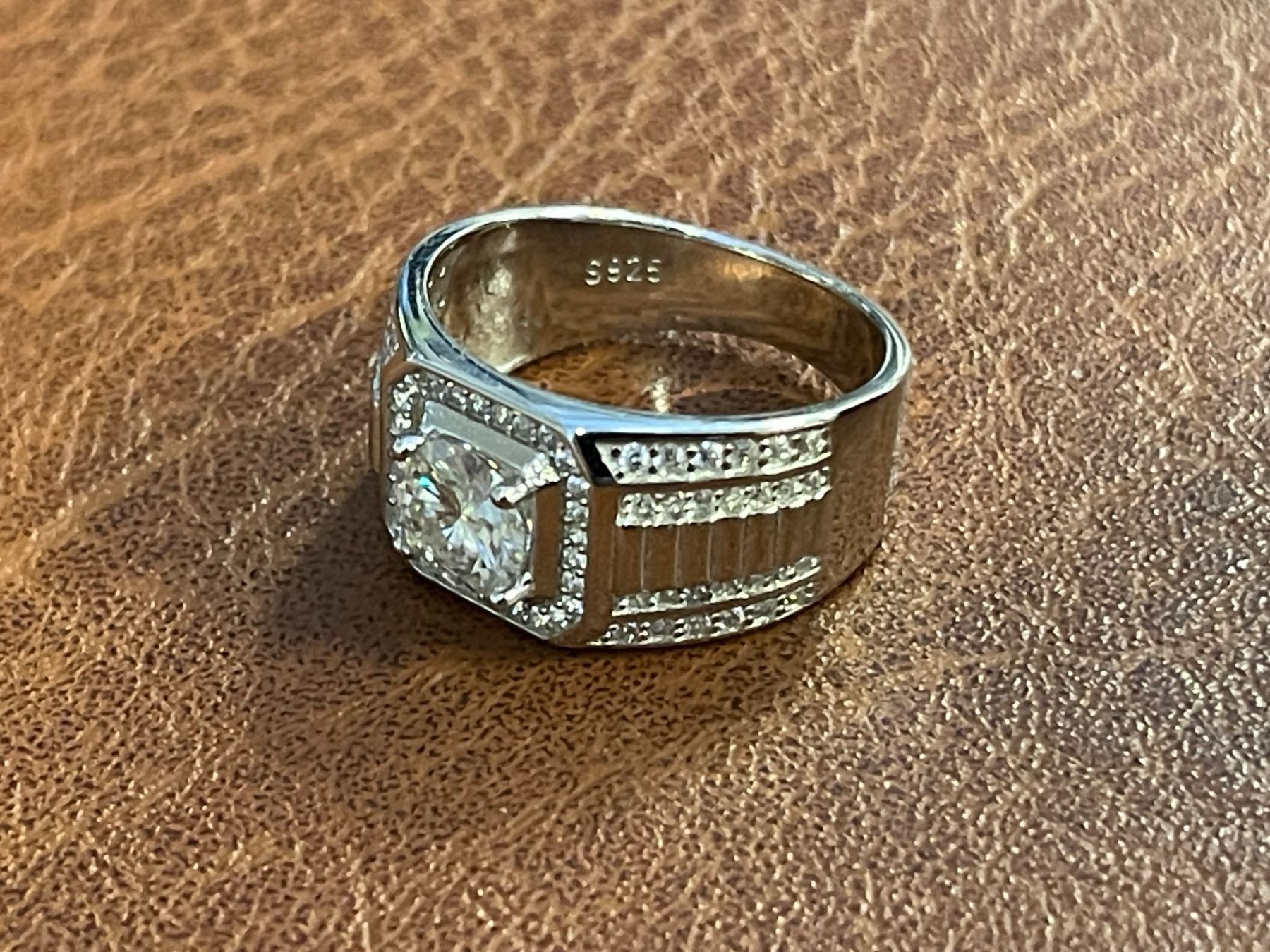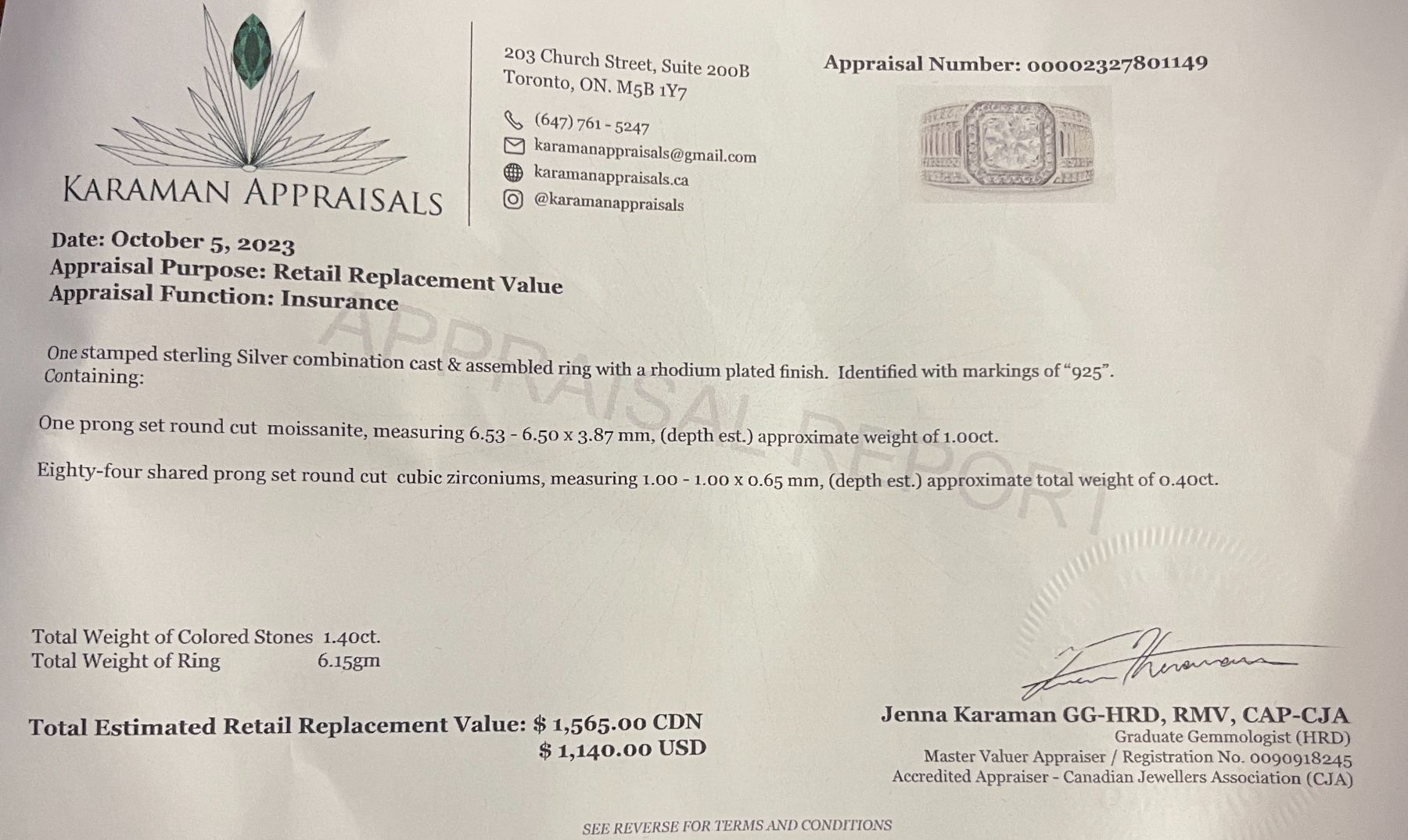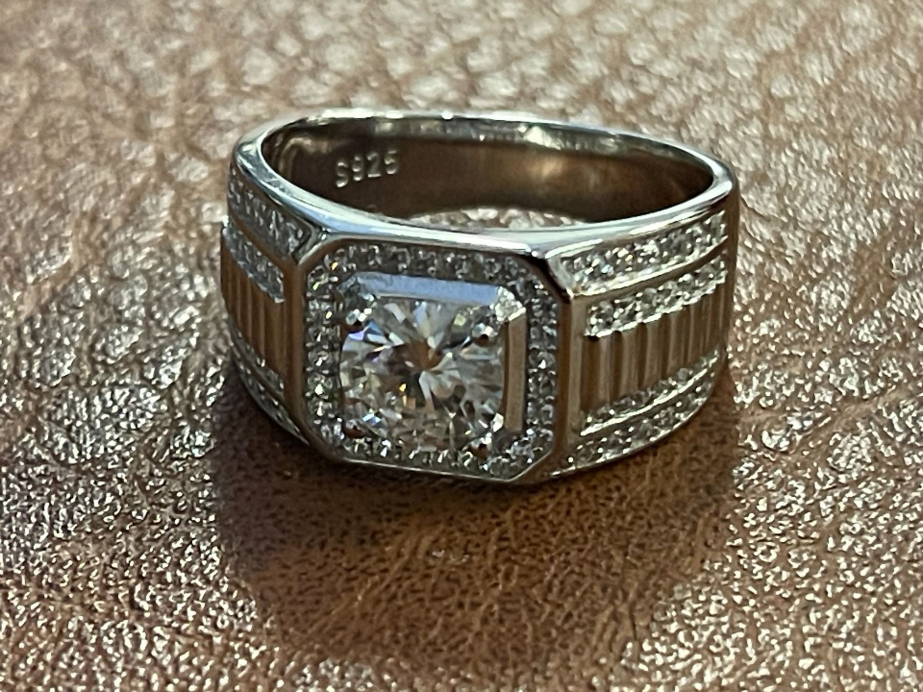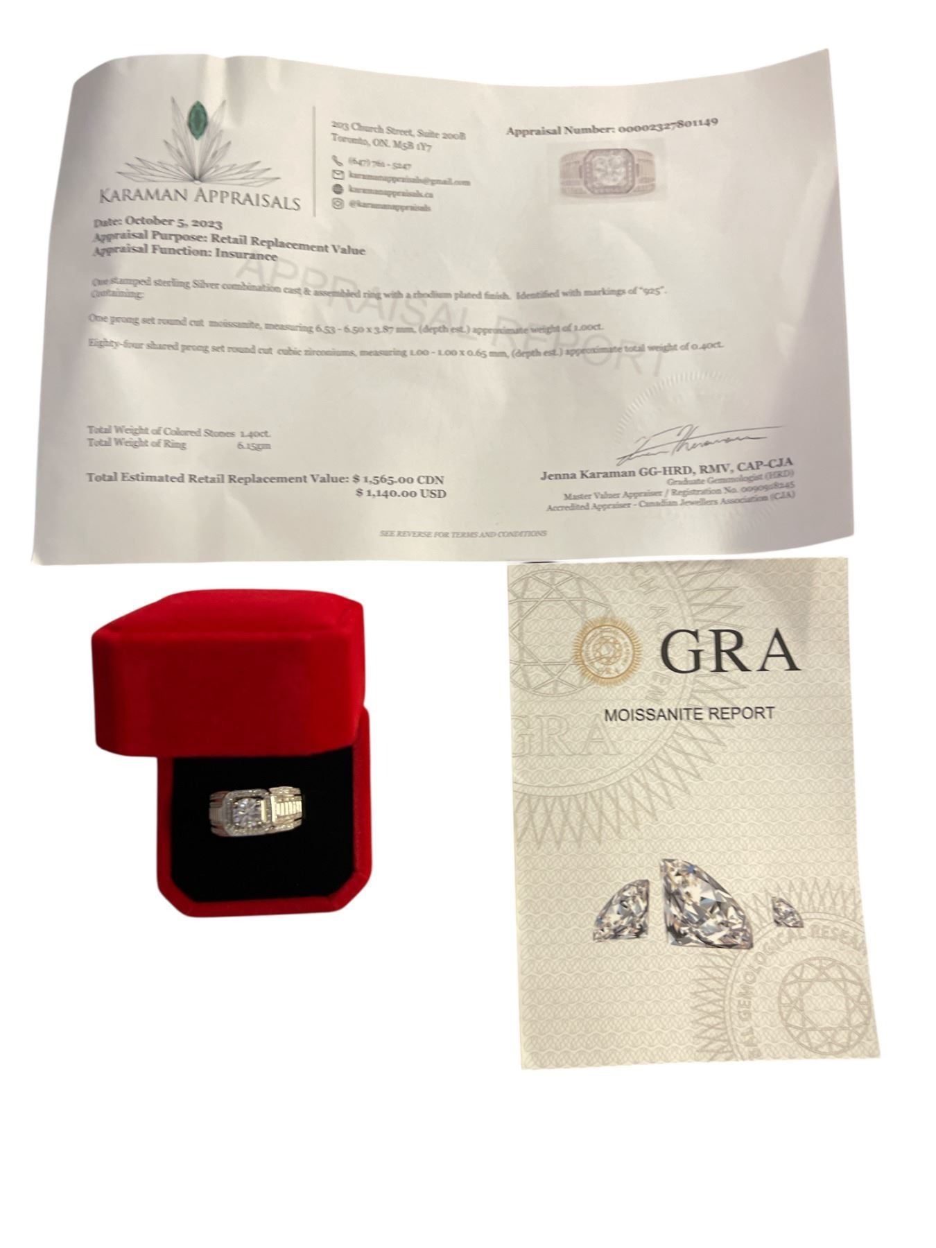 1.00 CT GRA CERTIFIED ROUND BRILLIANT CUT MOISSANITE STONE VVS D COLOR WITH THE 84 CUBIC ZIRCONIA STONES SET THROUGH-OUT THE RING SET IN 925 SILVER RING SIZE 8.25 RETAIL VALUE $1,565.00