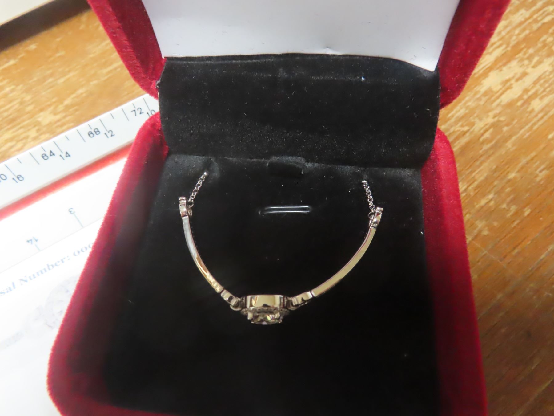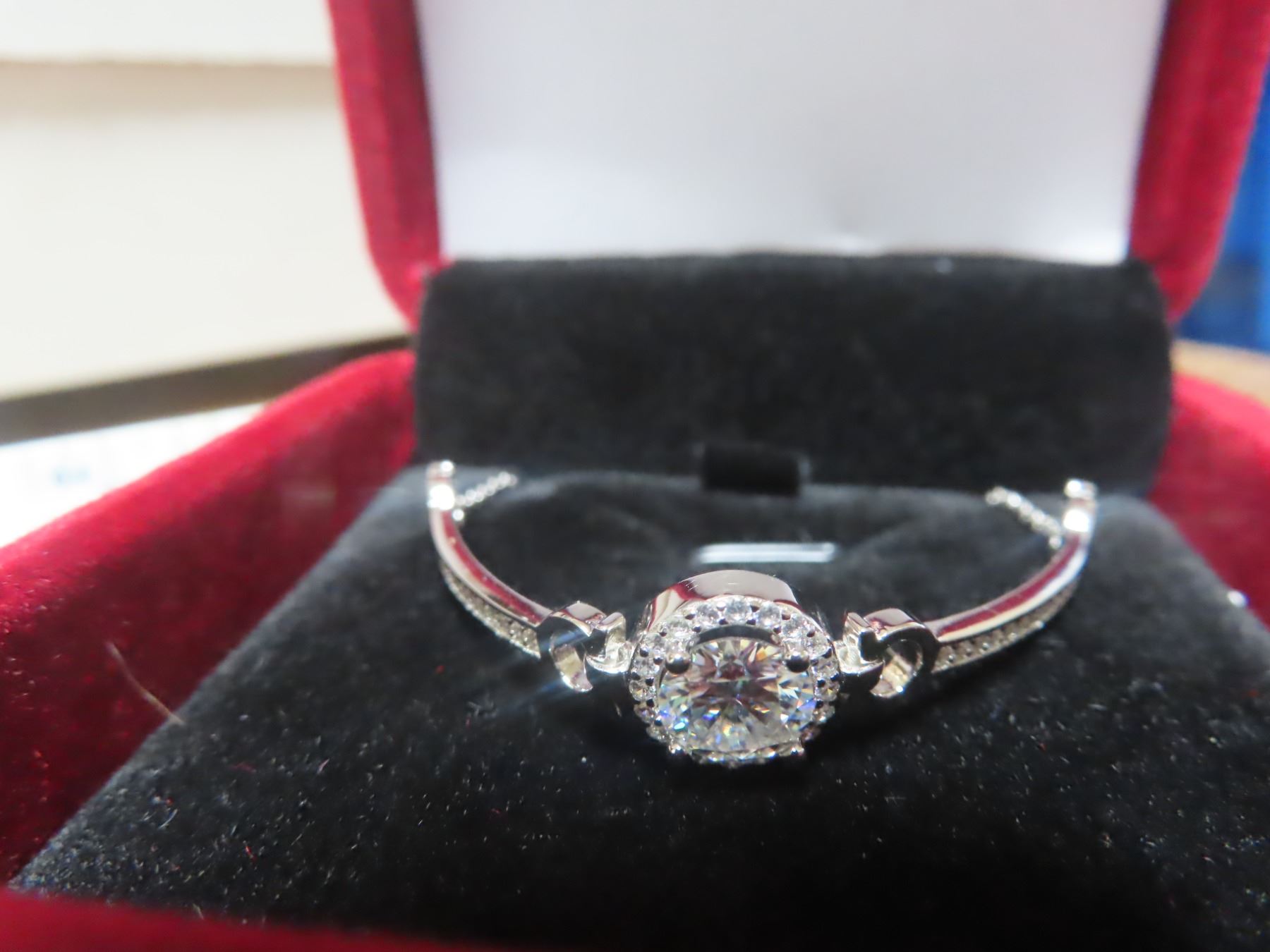 ROUND BRILLIANT CUT MOISSANITE STONES VVS D COLOR SET IN CENTER OF ROUND HALO WITH 52 ROUND BRILLIANT CUT CUBIC ZIRCONIA ALSO SET IN ARMS AND SET IN 925 SILVER BRACELET RETAIL VALUE $1,065.00