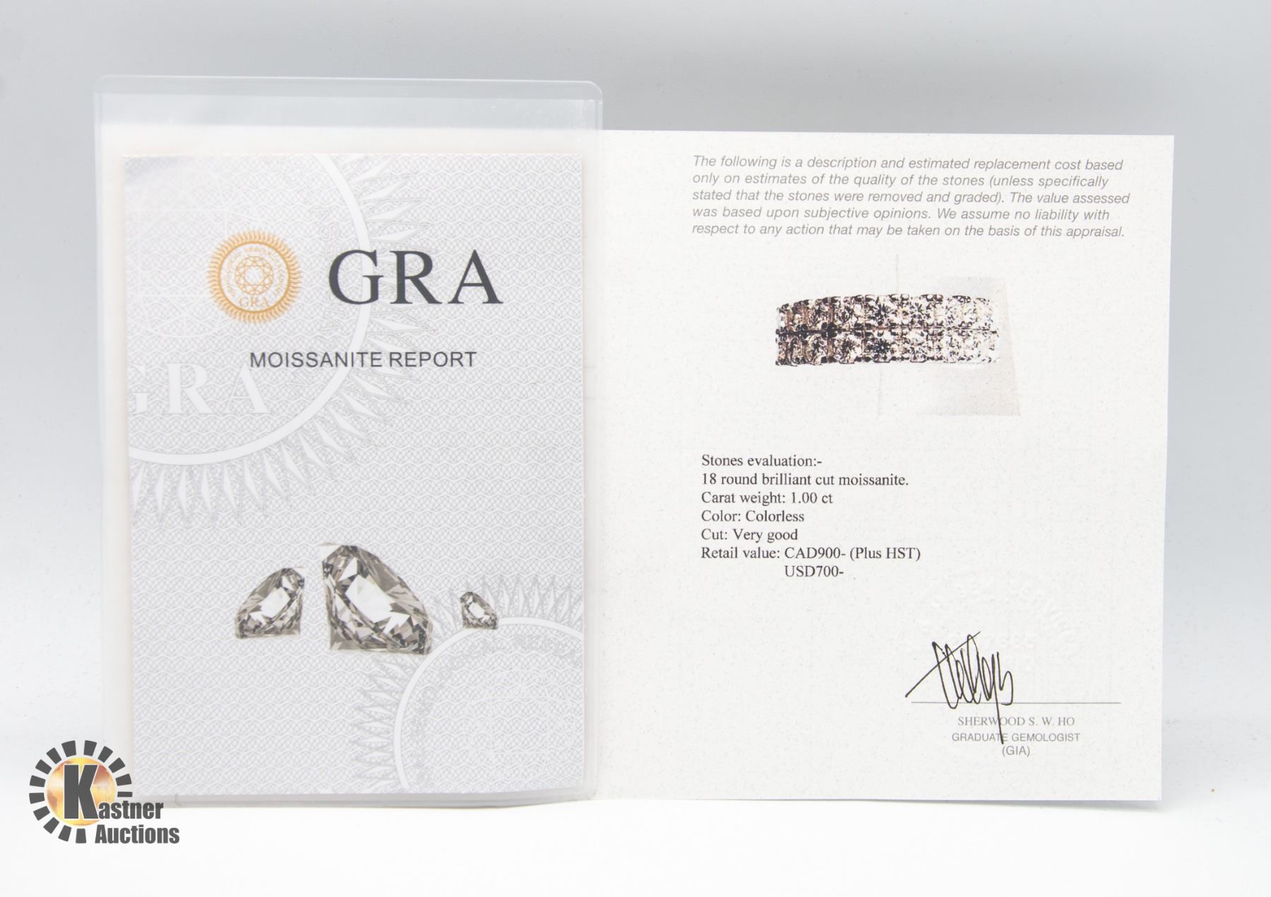 WITH 18 ROUND BRILLIANT CUT MOISSANITE RING SIZE 7 RETAIL VALUE $900.00 **ALL ITEMS MUST BE REMOVED BY 5PM SATURDAY, MARCH 23RD 2024. ALL REMAINING ITEMS WILL BE SUBJECT TO A $6.00 PER DAY STORAGE CHARGE. ANY ITEMS REMAINING AFTER MONDAY, APRIL 8TH, 2023 WILL BE CONSIDERED FORFEITED. NO REFUNDS WILL BE ISSUED FOR FORFEITED ITEMS. TO SCHEDULE A PICK UP APPOINTMENT CLICK HERE