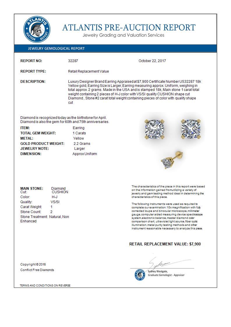 REF-180H2A -32287 ---- 1.00 CTW Cushion Cut VS/SI Diamond Stud Designer Earrings 18K Yellow Gold ---- Luxury Designer Brand Earring Appraised at $7,900 Certificate Number US32287 18k Yellow gold, Earring Size is Larger, Earring measuring approx. Uniform, weighing in total approx. 2 grams. Made in the USA and is stamped 18k, Main stone 1 carat total weight containing 2 pieces of H-J color with VS/SI quality CUSHION shape cut Diamond , Stone #2 carat total weight containing pieces of color with quality shape cut