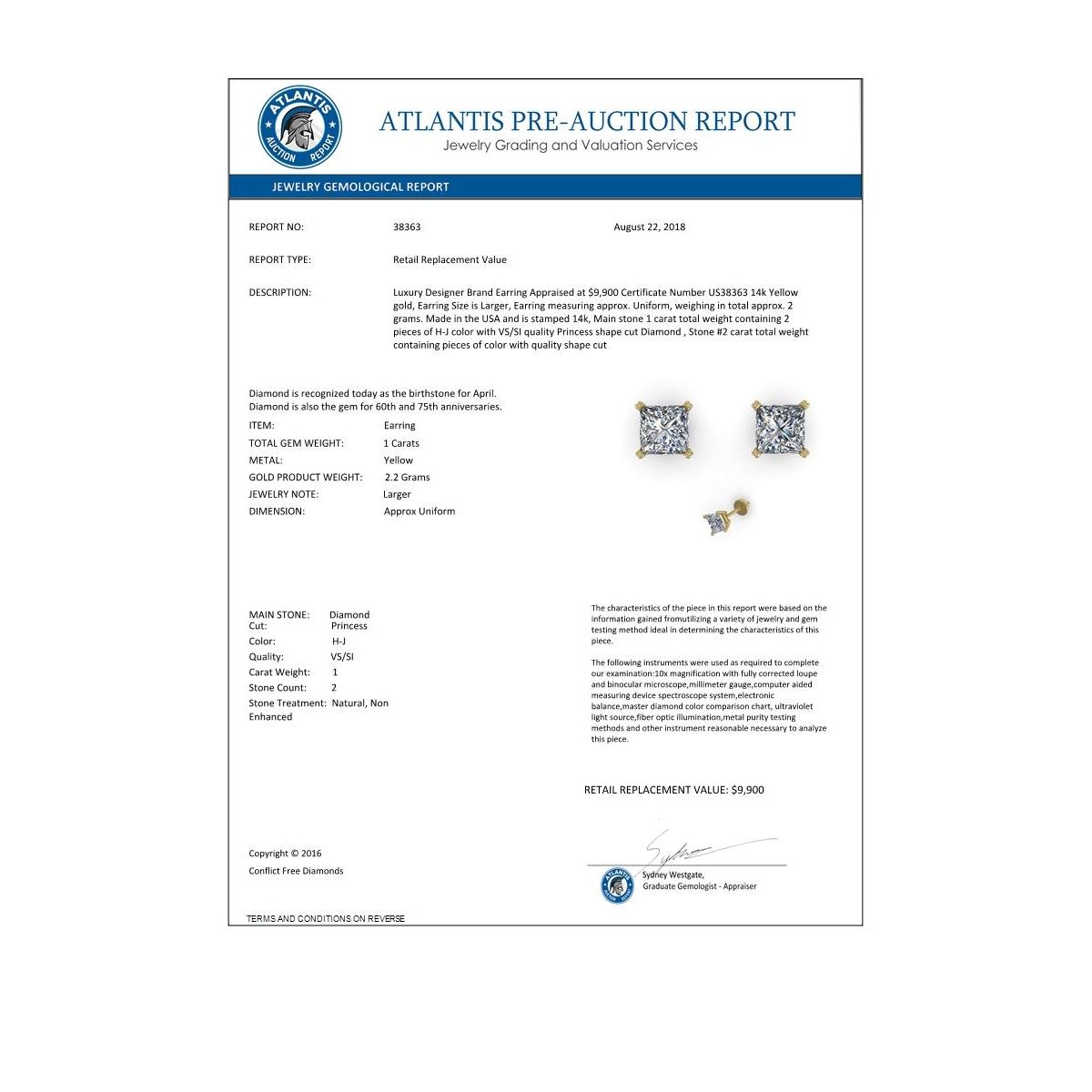 REF-148F5N -38363 ---- 1.00 CTW Princess Cut VS/SI Diamond Stud Designer Earrings 14K Yellow Gold ---- Luxury Designer Brand Earring Appraised at $9,900 Certificate Number US38363 14k Yellow gold, Earring Size is Larger, Earring measuring approx. Uniform, weighing in total approx. 2 grams. Made in the USA and is stamped 14k, Main stone 1 carat total weight containing 2 pieces of H-J color with VS/SI quality Princess shape cut Diamond , Stone #2 carat total weight containing pieces of color with quality shape cut
