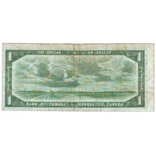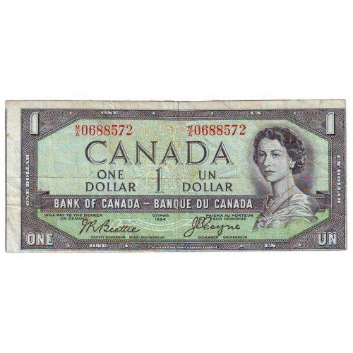 Bank of Canada, $1.00 Devil's Face Error note 1954, grade Fine, Charlton # BC-29b, signature Beattie Coyne, serial M/A0688572. Off Center with a part of another note to the left.