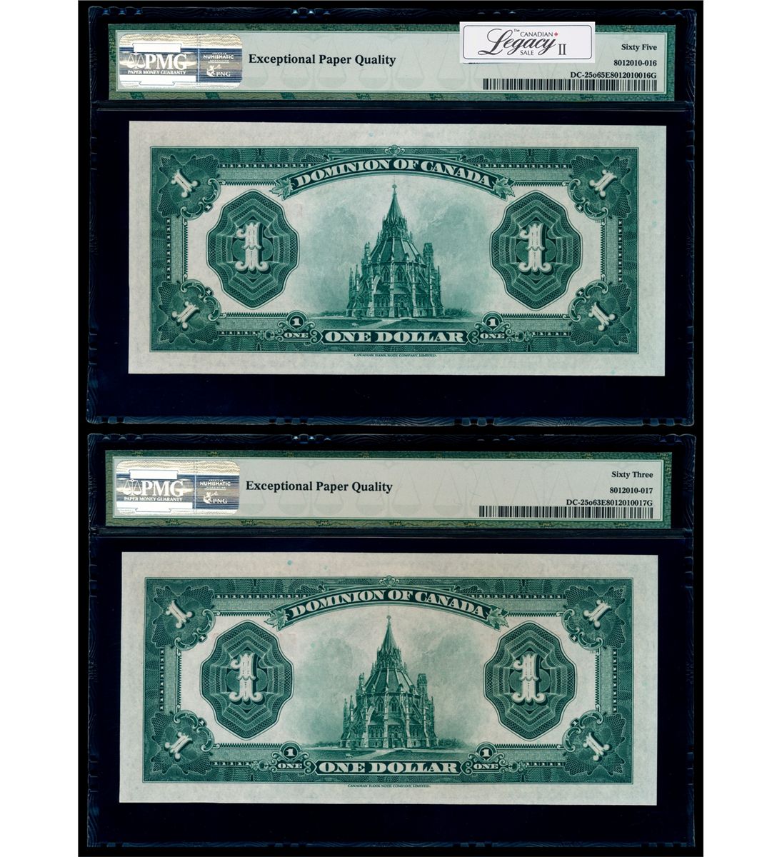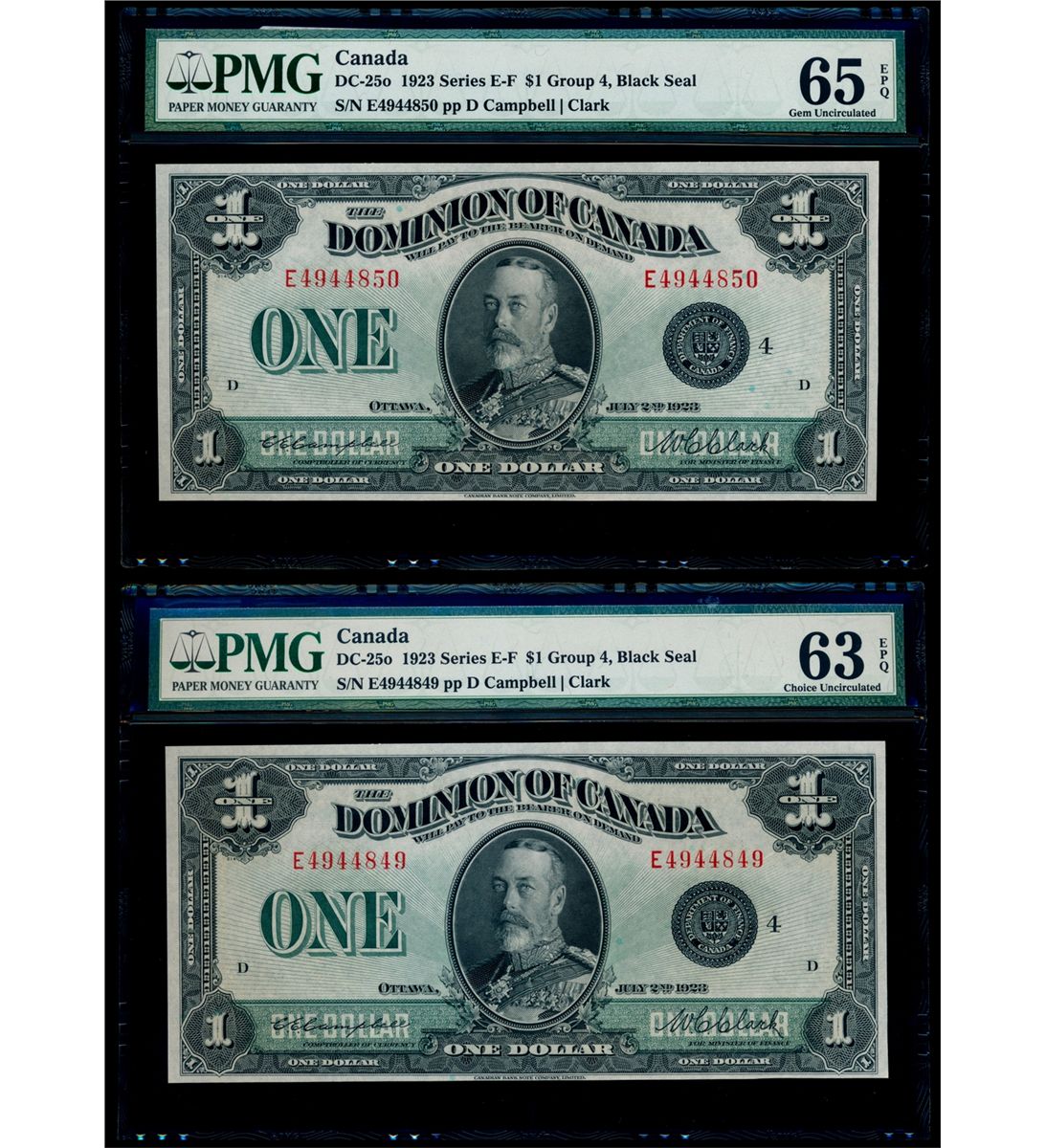 $1.00. July 2, 1923. DC-25o. Campbell-Sellar. Black seal, Group 4. Series 'E'. No.4944849/50/D. Lot of two (2) Consecutive Serial Number Notes, PMG graded Choice Uncirculated-63 EPQ and Gem Uncirculated-65 EPQ.