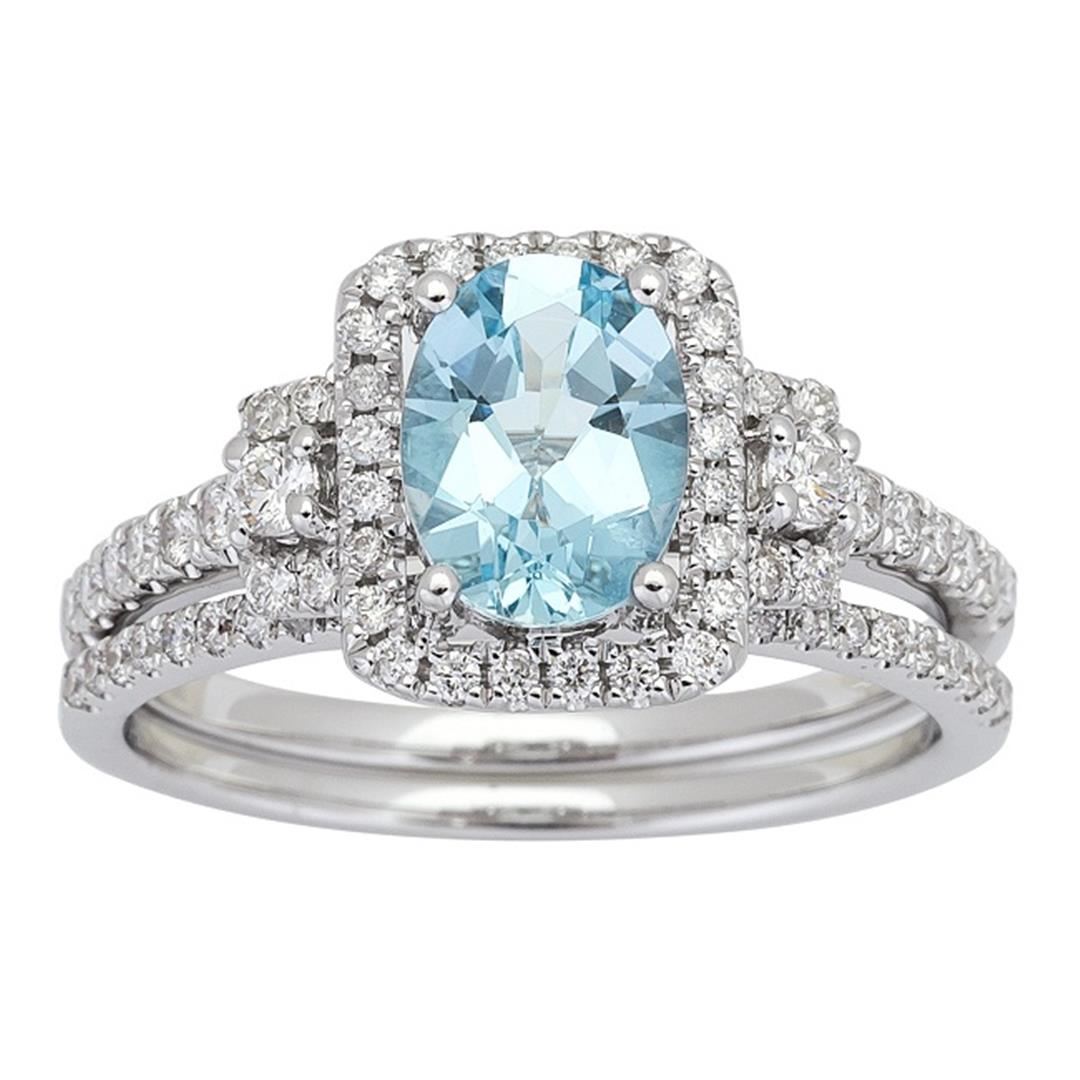 One Aquamarine and Diamond Ring featuring: 14KT White Gold with a total weight of 3.68 grams, Aquamarine with a total weight of 1.00ct, and 71 Round Cut Diamonds with a total weight of 0.52ctw.