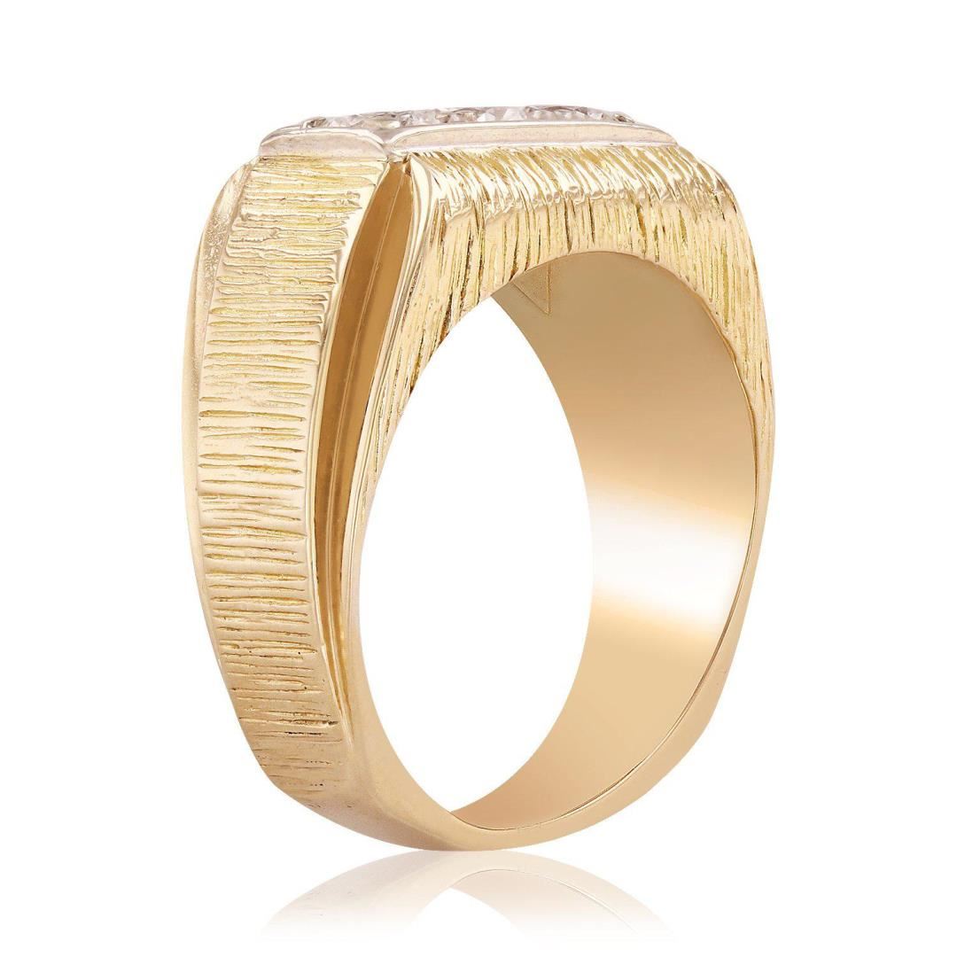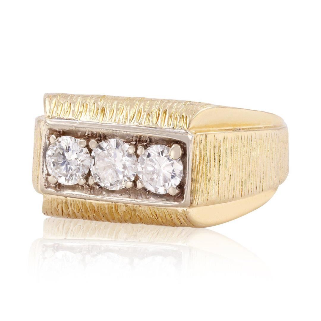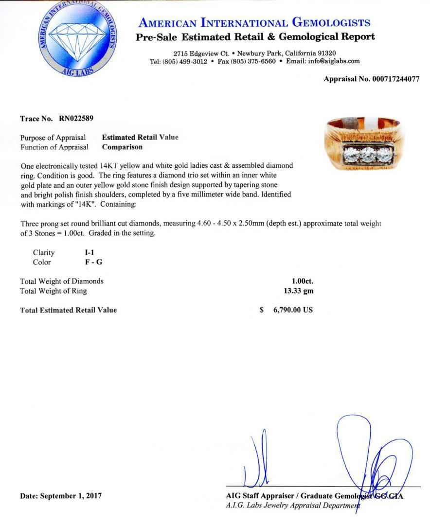 One electronically tested 14KT yellow and white gold ladies cast and assembled diamond ring. Condition is good. The ring features a diamond trio set within an inner white gold plate and an outer yellow gold stone finish design supported by tapering stone and bright polish finish shoulders, completed by a five millimeter wide band. Identified with markings of "14K". Containing: Three prong set round brilliant cut diamonds, measuring 4.60 - 4.50 x 2.50mm (depth est.) approximate total weight of 3 Stones = 1.00ct. Graded in the setting. Clarity I-1 Color F - G Total Weight of Diamonds 1.00ct. Total Weight of Ring 13.33 gm Size: 7