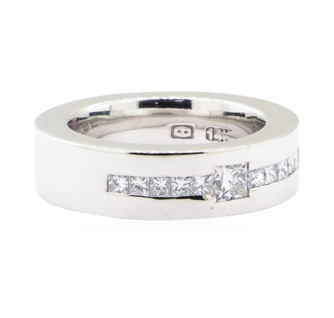 One electronically tested 14KT white gold man's cast wedding band with a pipe cut comfort fit with a bright polish finish. The featured man's ring has a shank measuring 7.40 millimeters wide. Identified with markings of '14K'. Condition is new, good workmanship. Containing: One channel set princess cut diamond, measuring 4.00 x 3.90 x 2.93mm (depth est.) approximate weight of 0.38ct. Graded in the setting. Color H - I Clarity VS-1 Cut Very Good Ten channel set princess cut diamonds, measuring 2.20 x 2.10 x 1.58mm (depth est.) approximate total weight of 10 Stones = 0.62ct. Graded in the setting. Color H - I Clarity VS-1 to VS-2 Cut Good. Total Weight of Diamonds 1.00ct.. Total Weight of Band 25.20gm GAS Appraised at $5560.00. GAS Appraised.