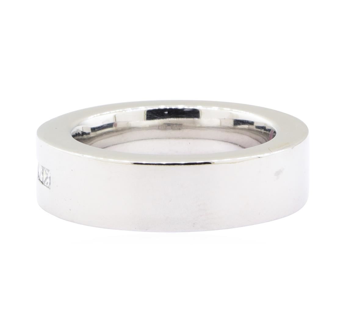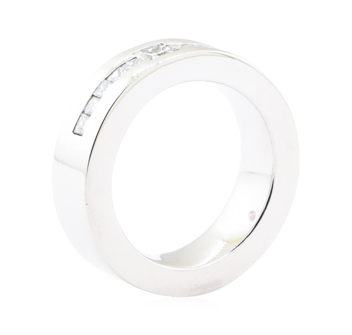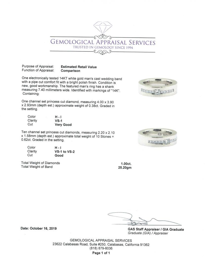 One electronically tested 14KT white gold man's cast wedding band with a pipe cut comfort fit with a bright polish finish. The featured man's ring has a shank measuring 7.40 millimeters wide. Identified with markings of '14K'. Condition is new, good workmanship. Containing: One channel set princess cut diamond, measuring 4.00 x 3.90 x 2.93mm (depth est.) approximate weight of 0.38ct. Graded in the setting. Color H - I Clarity VS-1 Cut Very Good Ten channel set princess cut diamonds, measuring 2.20 x 2.10 x 1.58mm (depth est.) approximate total weight of 10 Stones = 0.62ct. Graded in the setting. Color H - I Clarity VS-1 to VS-2 Cut Good. Total Weight of Diamonds 1.00ct.. Total Weight of Band 25.20gm GAS Appraised at $5560.00. GAS Appraised.