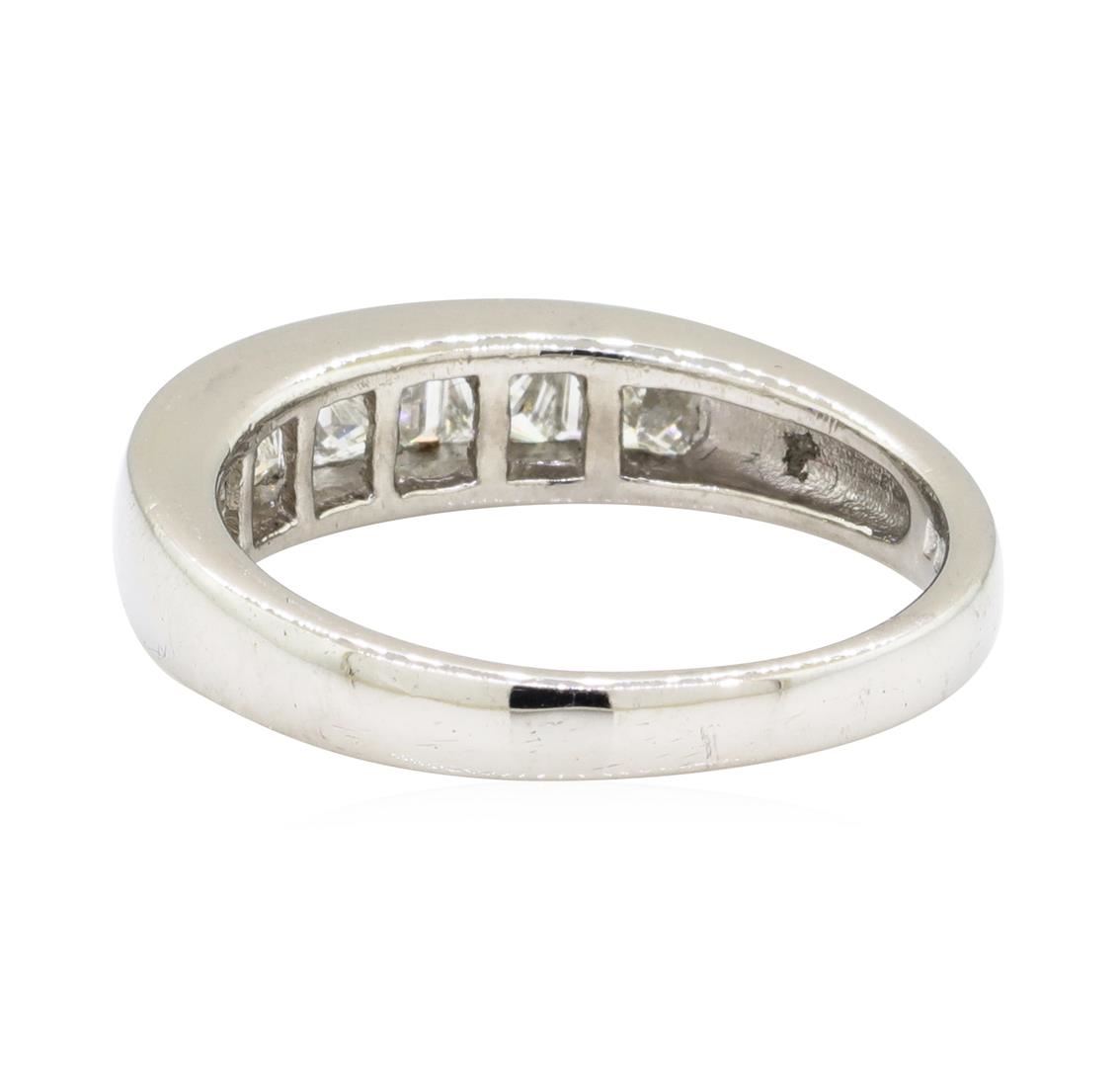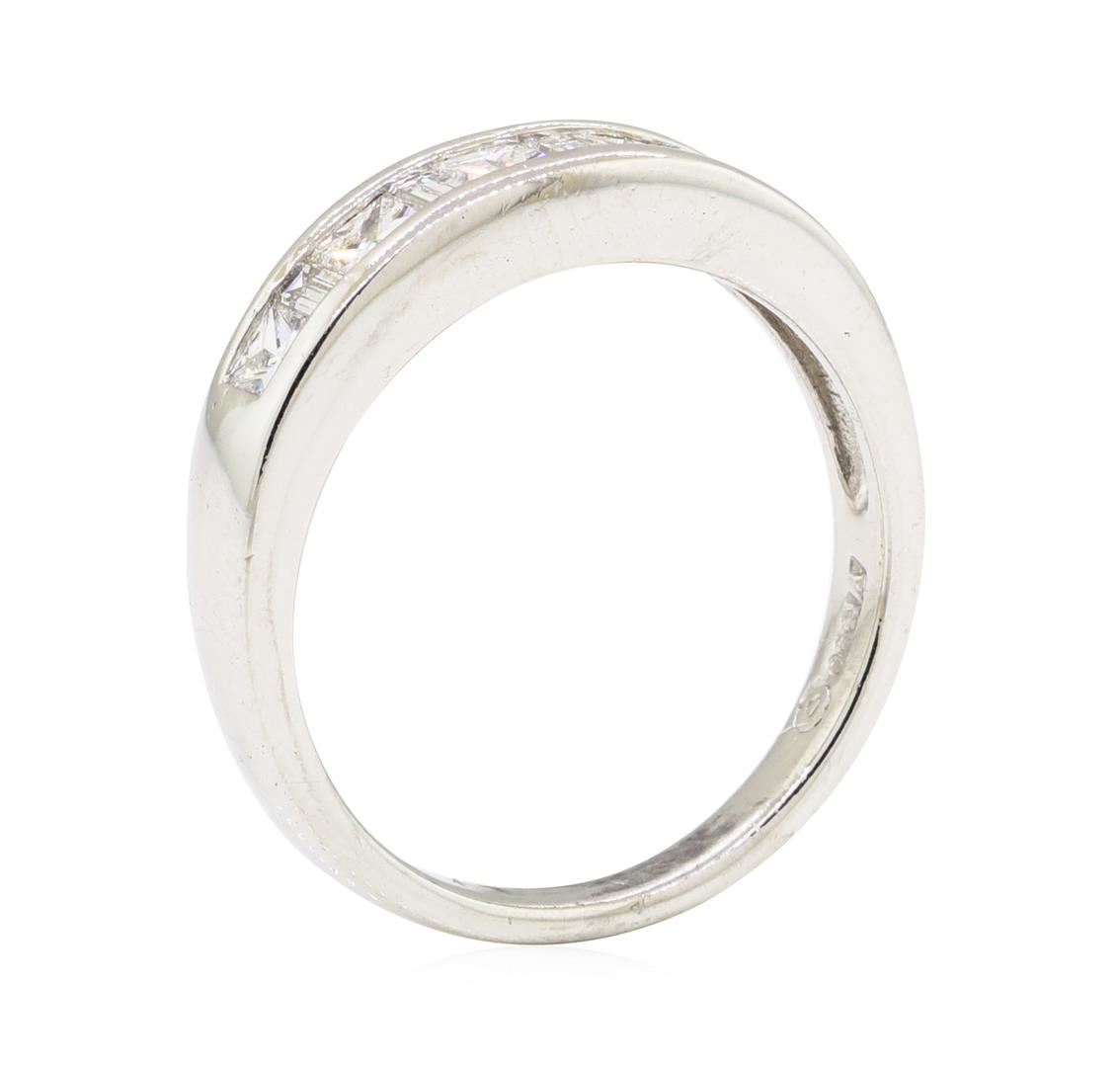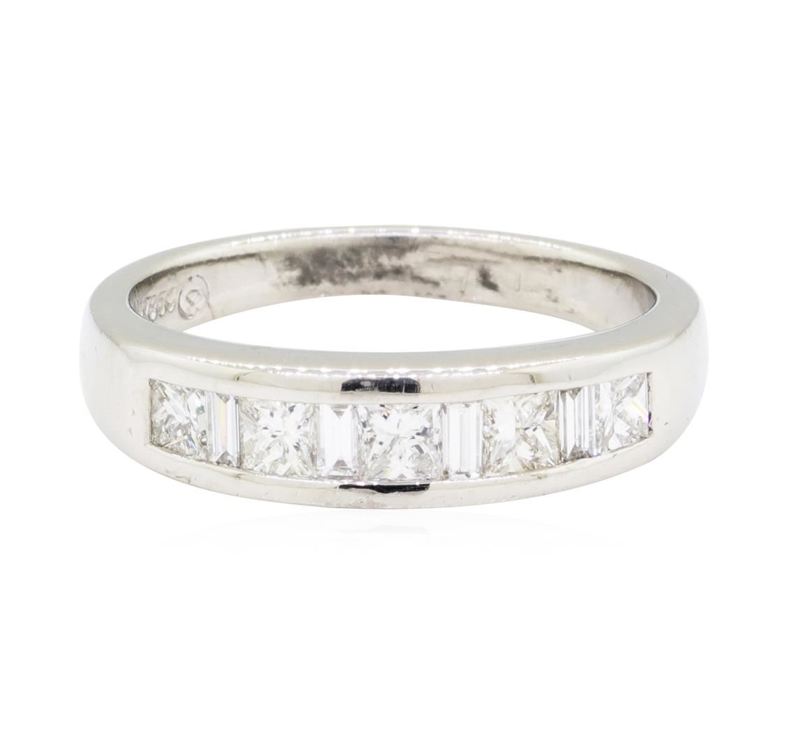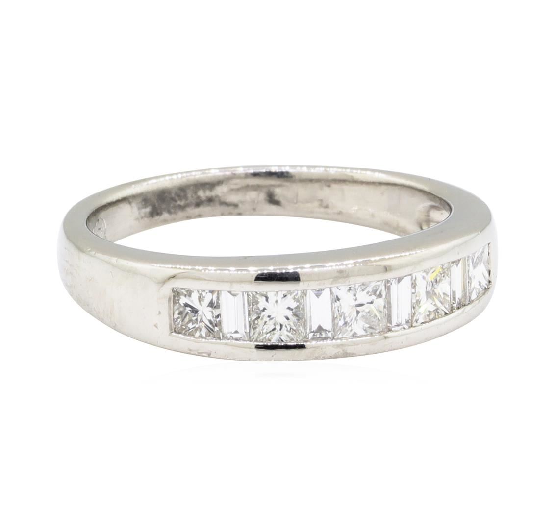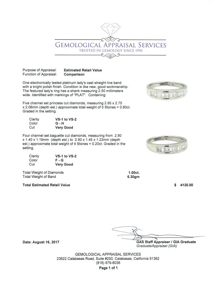One electronically tested platinum lady's cast straight line band with a bright polish finish. The featured lady's ring has a shank measuring 2.50 millimeters wide. Identified with markings of 'PLAT'. Condition is like new, good workmanship. Containing: Five channel set princess cut diamonds, measuring 2.95 x 2.75 x 2.06mm (depth est.) approximate total weight of 5 Stones = 0.80ct. Graded in the setting. Color G - H Clarity VS-1 to VS-2 Cut Very Good Four channel set baguette cut diamonds, measuring from 2.80 x 1.40 x 1.19mm (depth est.) to 2.90 x 1.45 x 1.23mm (depth est.) approximate total weight of 4 Stones = 0.20ct. Graded in the setting. Color F - G Clarity VS-1 to VS-2 Cut Very Good. Total Weight of Diamonds 1.00ct.. Total Weight of Band 6.30gm GAS Appraised at $4120.00. GAS Appraised at $4,120.00.