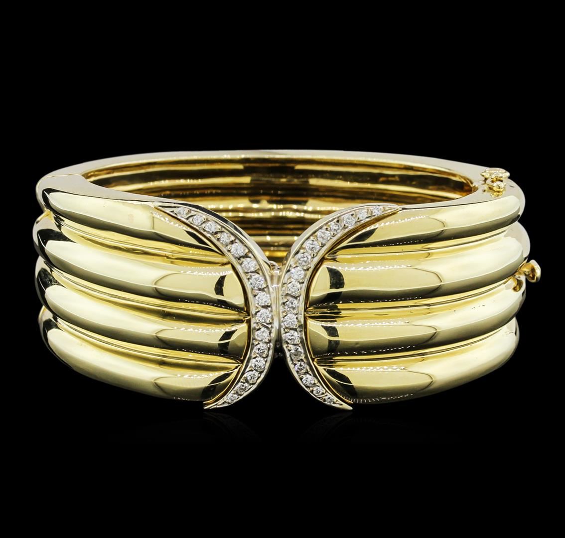 One electronically tested 14KT yellow and white gold lady's combination cast & assembled fashion bangle bracelet with a tongue clasp with foldover safety with a bright polish finish. The featured lady's bracelet has a detachable white gold insignia and an internal circumference of approximately 6.5 inches. Identified with markings of "14K". Condition is new, good workmanship. Containing: Twenty-Four bead set round brilliant cut diamonds, measuring 2.20 - 2.00 x 1.37mm (depth est.) approximate total weight of 24 Stones = 0.90ct. Graded in the setting. Clarity: VS-2 to SI-1. Color: H - I. Cut Good Eight bead set round brilliant cut diamonds, measuring 1.60 - 1.40 x 0.98mm (depth est.) approximate total weight of 8 Stones = 0.10ct. Graded in the setting. Clarity: VS-2 to SI-1. Color: G - Good. Total Weight of Diamonds 1.00ct. Total Weight of Bangle Bracelet 94.10gm. GAS Appraised at $10,745.00.