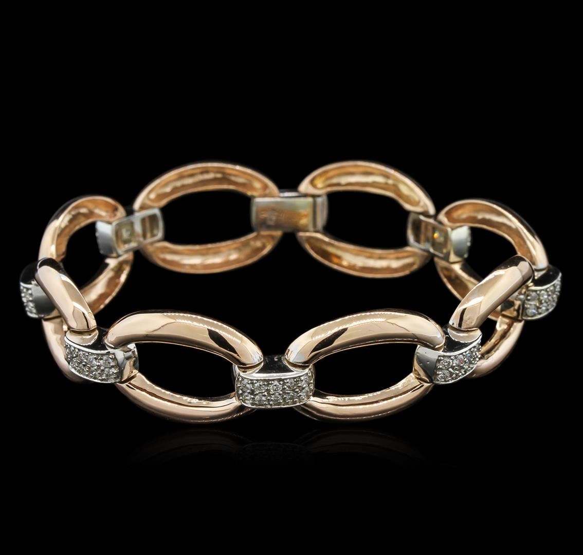 One electronically tested 14KT rose and white gold lady's combination cast & assembled bracelet with a foldover clasp with a bright polish finish. The featured bracelet is approximately 7.25" in length. Identified with markings of "14K". Condition is new, good workmanship. Containing: Seventy prong set round brilliant cut diamonds, measuring 1.60 - 1.50 x 0.93mm (depth est.) approximate. Total Weight of 70 Stones = 1.00ct. Graded in the setting. Clarity: SI-2 to I-1. Color: H - Good. Total Weight of Diamonds 1.00ct. Total Weight of Bracelet 24.20gm. GAS Appraised.