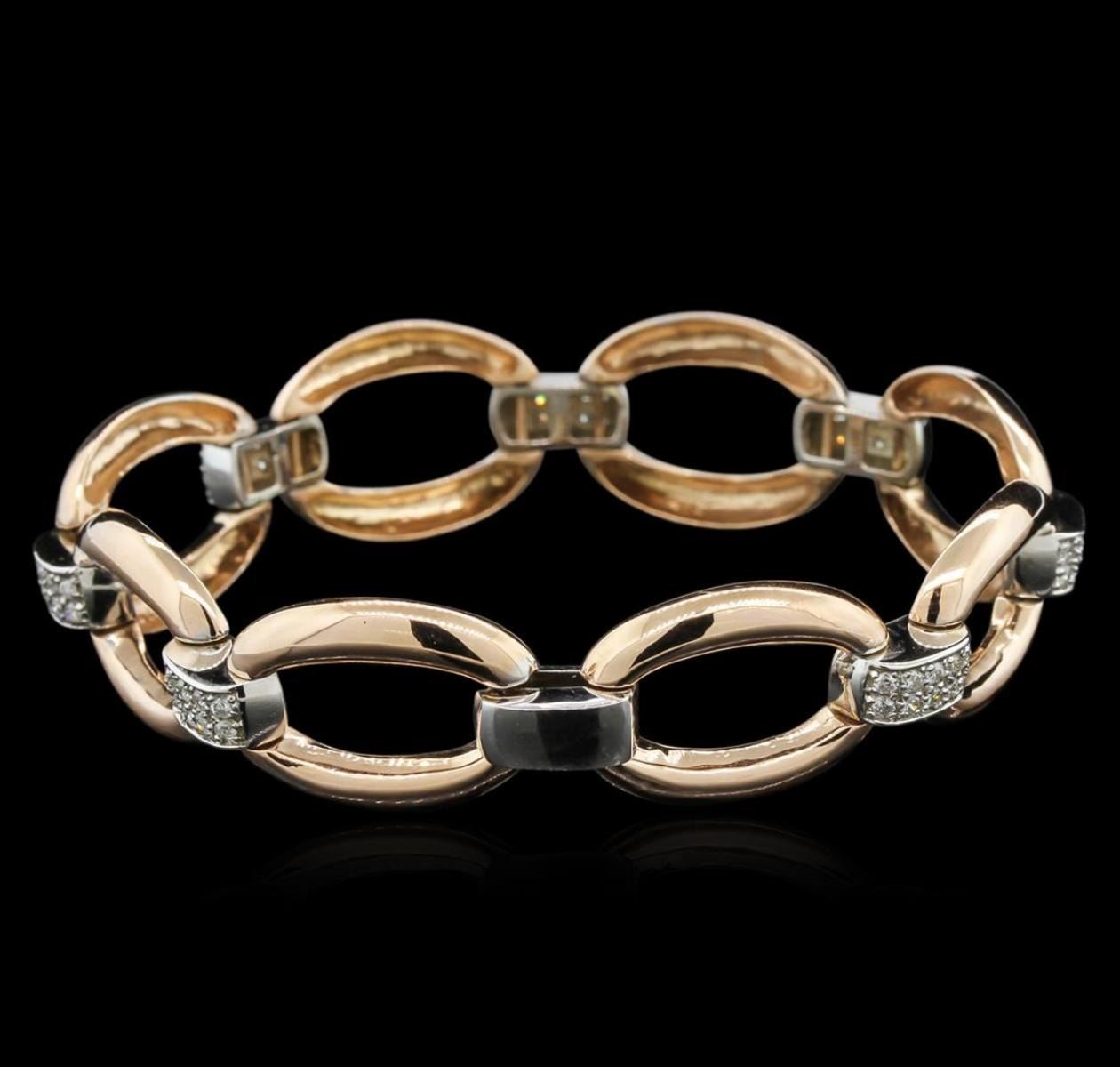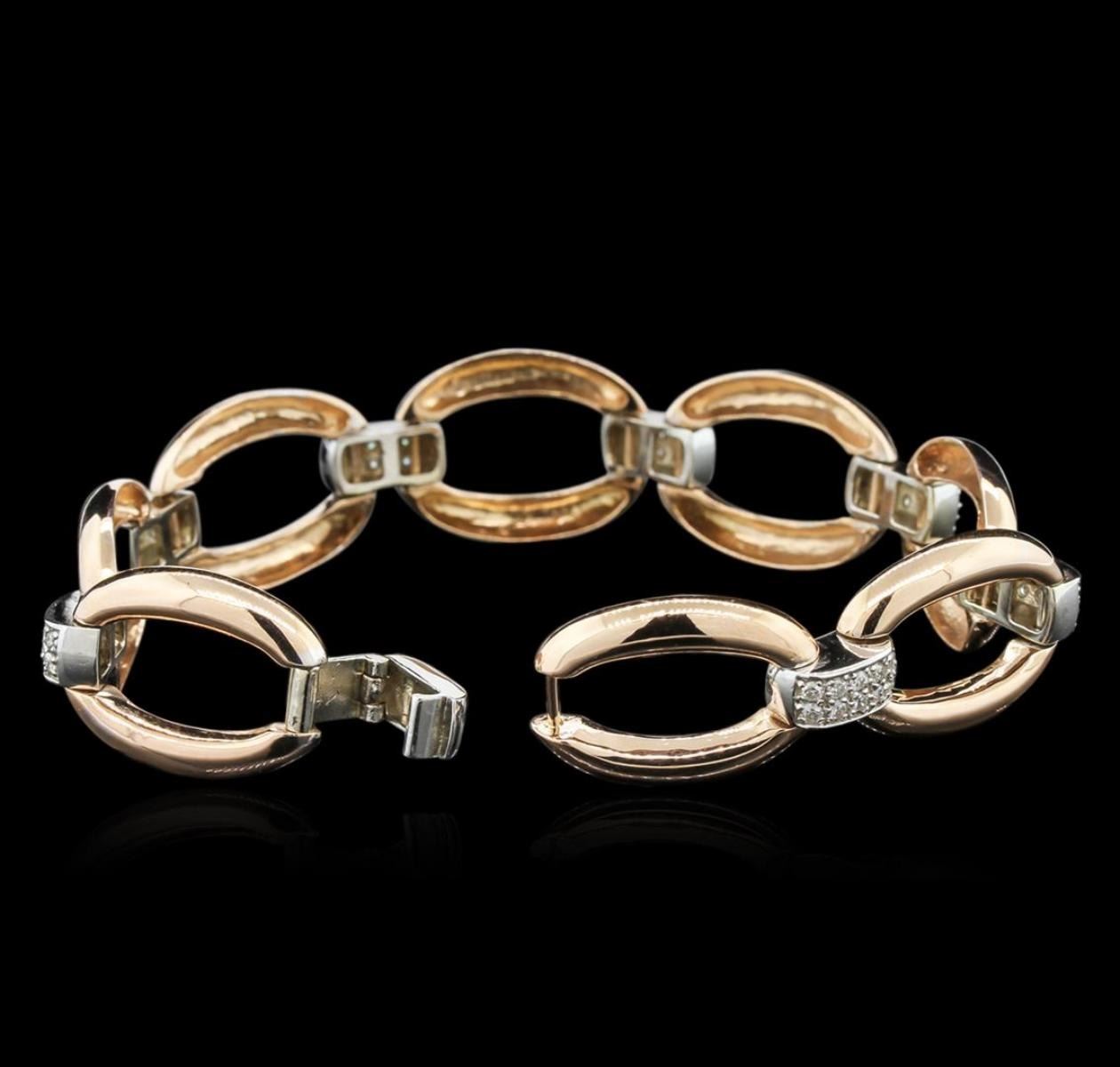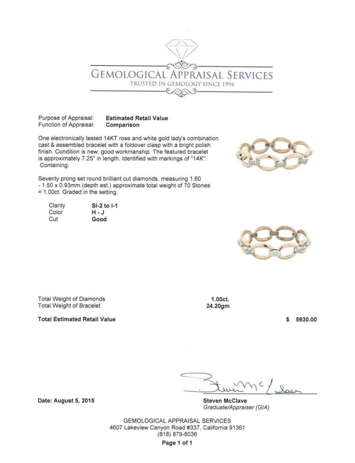 One electronically tested 14KT rose and white gold lady's combination cast & assembled bracelet with a foldover clasp with a bright polish finish. The featured bracelet is approximately 7.25" in length. Identified with markings of "14K". Condition is new, good workmanship. Containing: Seventy prong set round brilliant cut diamonds, measuring 1.60 - 1.50 x 0.93mm (depth est.) approximate. Total Weight of 70 Stones = 1.00 ct. Graded in the setting. Clarity: SI-2 to I-1. Color: H - Good. Total Weight of Diamonds 1.00 ct. Total Weight of Bracelet 24.20gm. GAS Appraised.