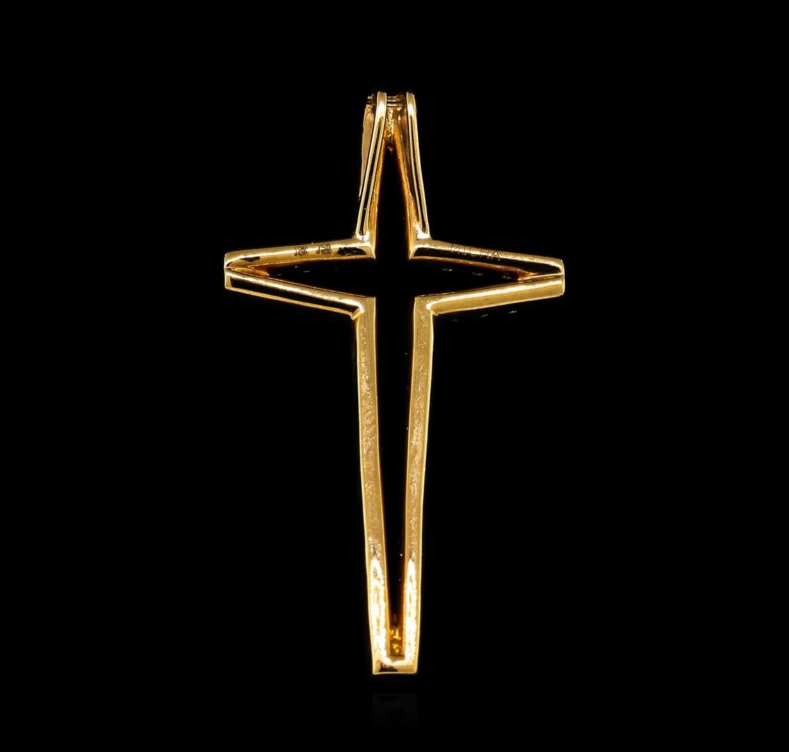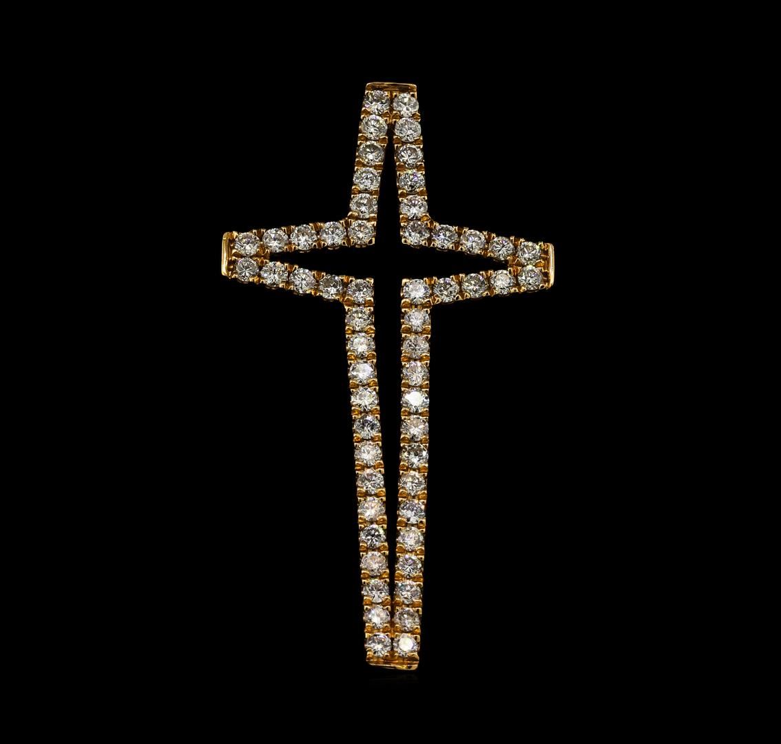 One electronically tested 18KT rose gold ladies cast diamond cross pendant. The pendant features a diamond ribbon cross outline, completed by a hidden bail. Measures forty millimeter long by twenty one millimeters wide. Bright polish finish. Trademark is MICHA. Identified with markings of '18K 750'. Condition is good. Containing: Fifty-Six prong set round brilliant cut diamonds, measuring 1.70 - 1.60 x 0.99mm (depth est.) approximate total weight of 56 Stones = 1.00ct. Graded in the setting. Clarity SI-2 to I-2. Color: E - G. Total Weight of Diamonds 1.00ct.. Total Weight of Pendant 3.38gm. AIG Appraised at $3,545.00.