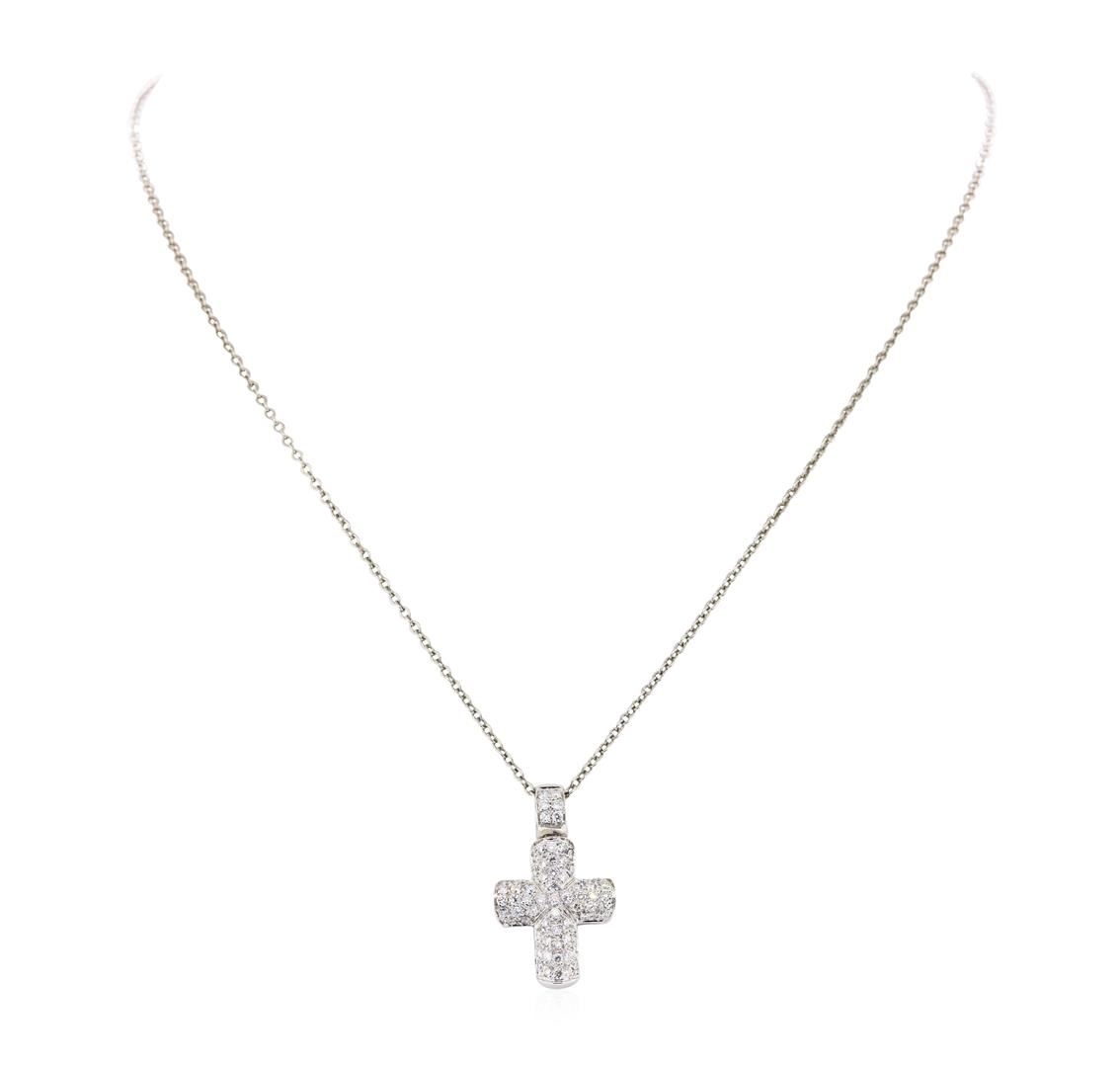 One cross pendant with chain featuring: 18KT white gold pendant weighing 7.4 grams and a stainless steel chain containing diamonds weighing 1.00ctw.