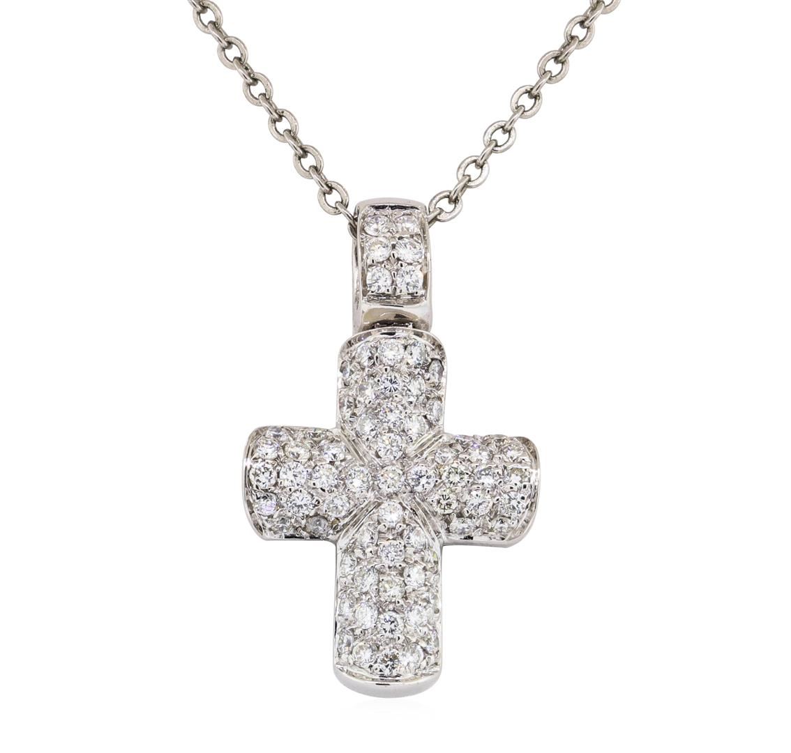 One cross pendant with chain featuring: 18KT white gold pendant weighing 7.4 grams and a stainless steel chain containing diamonds weighing 1.00ctw.
