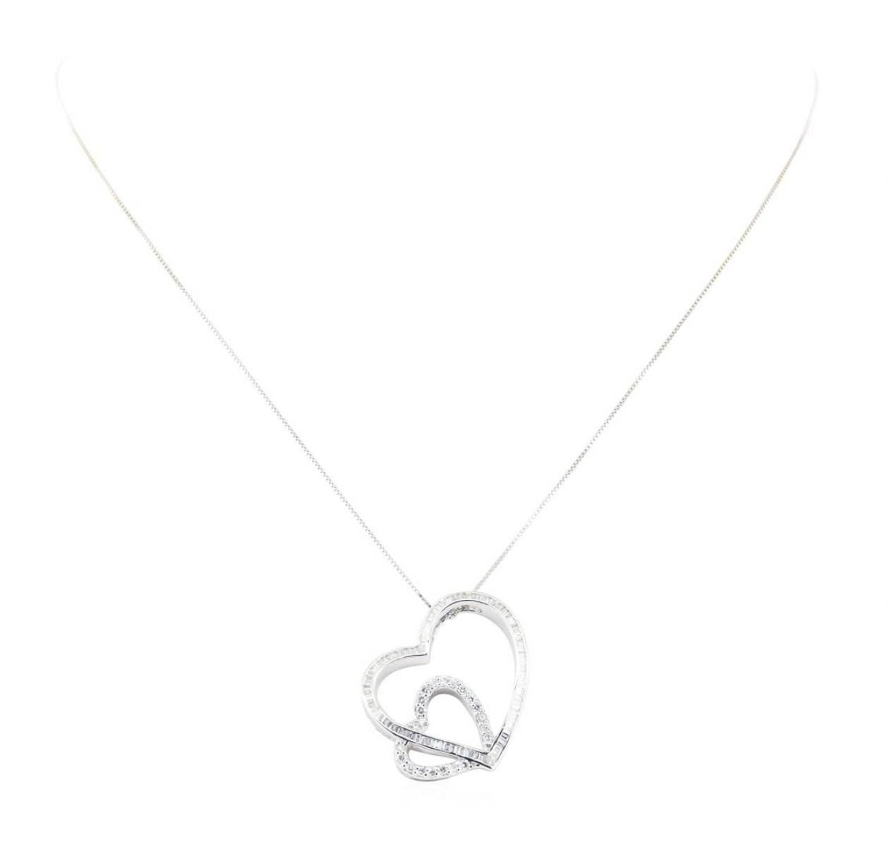 One double heart shaped pendant with an attached 14KT white gold chain featuring: 14KT and 18KT white gold weighing 6.1 grams containing diamonds weighing 1.00ctw. The chain is a 0.7mm box link chain measuring sixteen inches in length.
