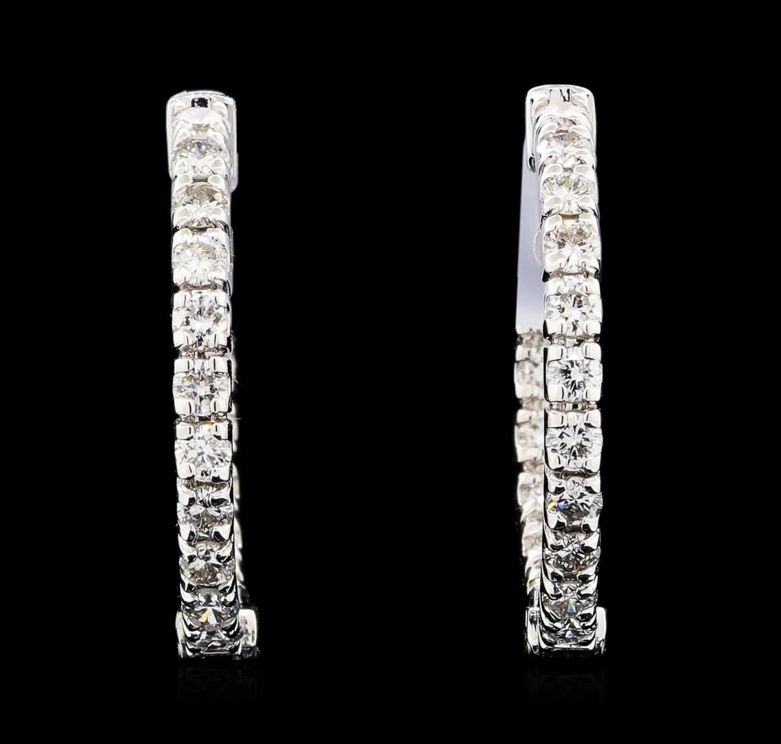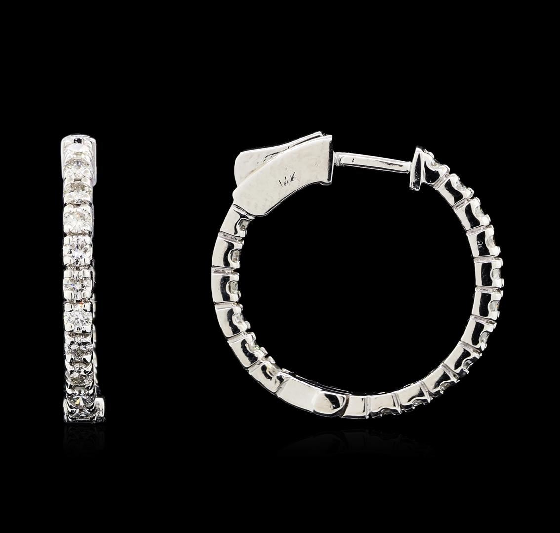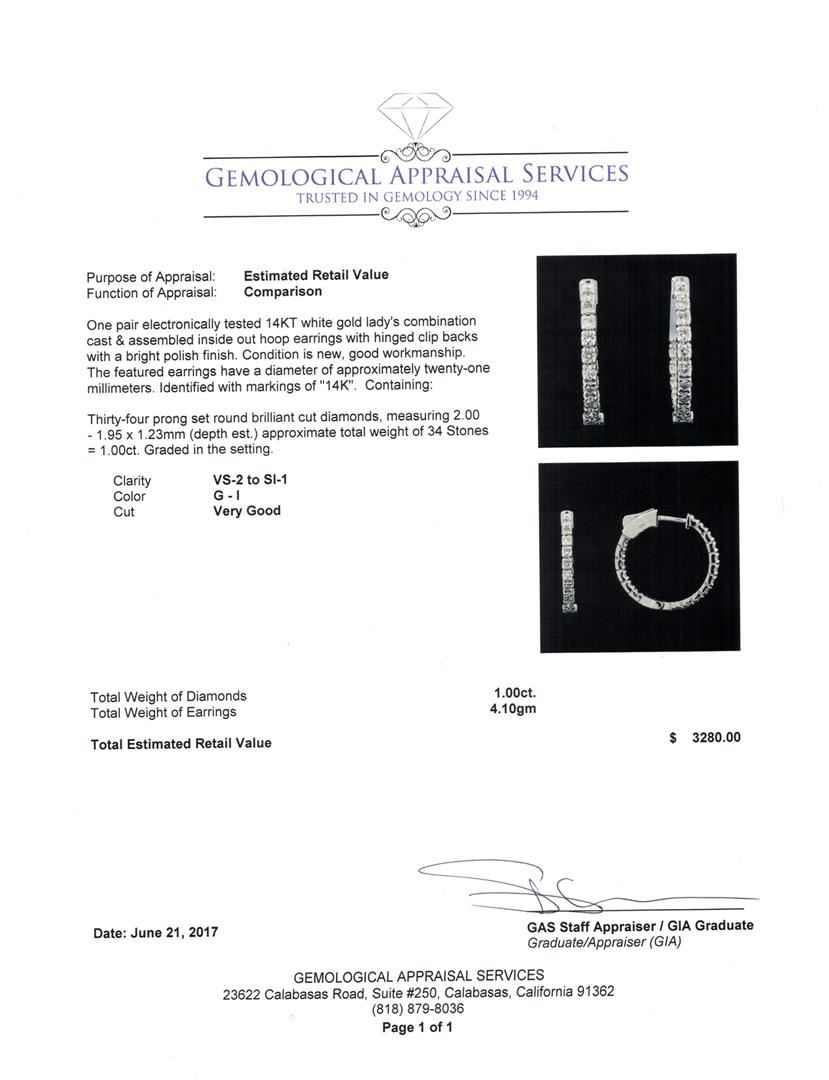 One pair electronically tested 14KT white gold lady's combination cast & assembled inside out hoop earrings with hinged clip backs with a bright polish finish. The featured earrings have a diameter of approximately twenty-one millimeters. Identified with markings of '14K'. Condition is new, good workmanship. Containing: Thirty-Four prong set round brilliant cut diamonds, measuring 2.00 - 1.95 x 1.23mm (depth est.) approximate total weight of 34 Stones = 1.00ct. Graded in the setting. Color G - I Clarity VS-2 to SI-1 Cut Very Good. Total Weight of Diamonds 1.00ct.. Total Weight of Earrings 4.10gm GAS Appraised at $3280.00. GAS Appraised at $3,280.00.
