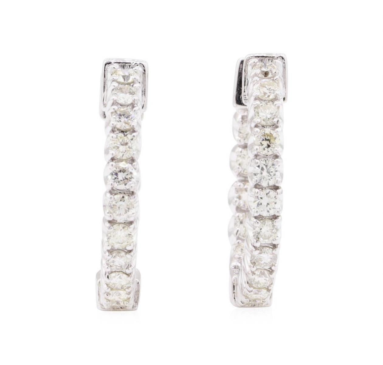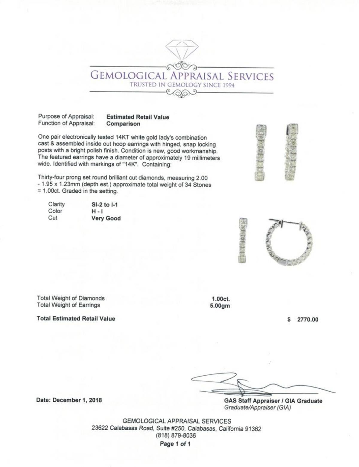 One pair electronically tested 14KT white gold lady's combination cast & assembled inside out hoop earrings with hinged, snap locking posts with a bright polish finish. The featured earrings have a diameter of approximately 19 millimeters wide. Identified with markings of '14K'. Condition is new, good workmanship. Containing: Thirty-Four prong set round brilliant cut diamonds, measuring 2.00 - 1.95 x 1.23mm (depth est.) approximate total weight of 34 Stones = 1.00ct. Graded in the setting. Color H - I Clarity SI-2 to I-1 Cut Very Good. Total Weight of Diamonds 1.00ct.. Total Weight of Earrings 5.00gm GAS Appraised at $2770.00. GAS Appraised.