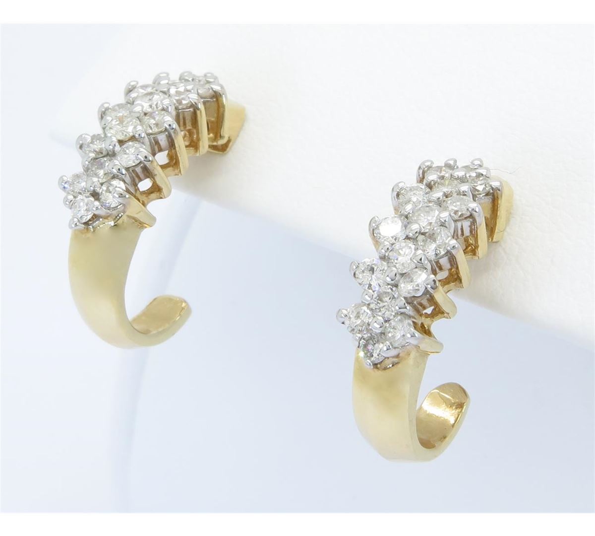 One pair of tested 14K yellow gold diamond earrings. Containing: 32 Round Brilliant Cut Diamonds. Clarity: I, Color: G-I. Approximate total diamond weight: 1CTW. Diamonds are graded in the mounting, unless otherwise stated. Weight: 5.6 grams.
