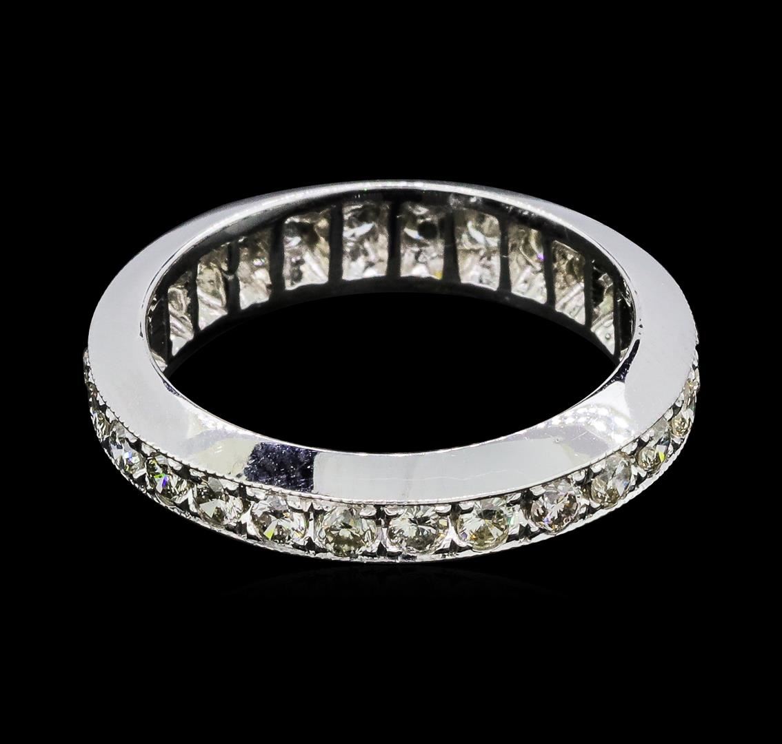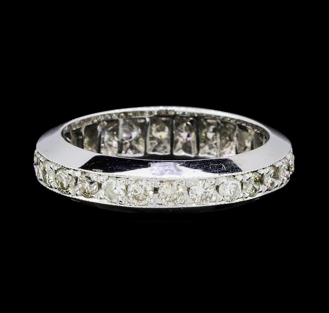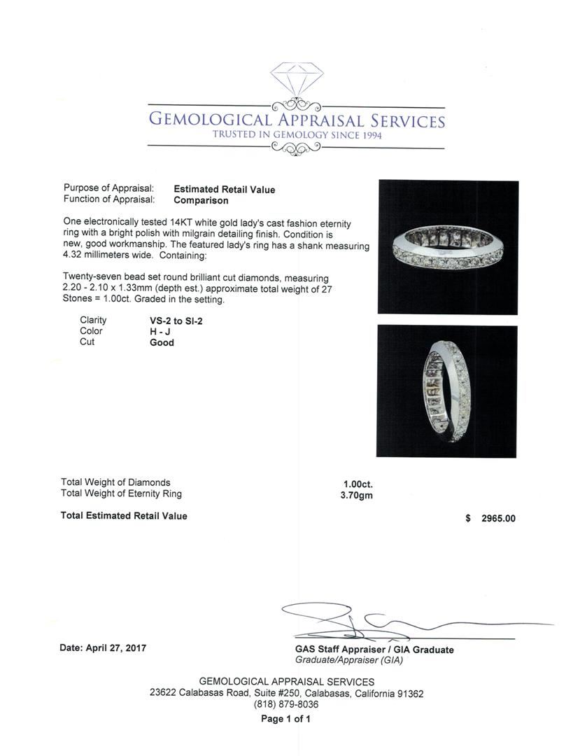 One electronically tested 14KT white gold lady's cast fashion eternity ring with a bright polish with milgrain detailing finish. The featured lady's ring has a shank measuring 4.32 millimeters wide. Condition is new, good workmanship. Containing: Twenty-Seven bead set round brilliant cut diamonds, measuring 2.20 - 2.10 x 1.33mm (depth est.) approximate total weight of 27 Stones = 1.00ct. Graded in the setting. Color H - J Clarity VS-2 to SI-2 Cut Good. Total Weight of Diamonds 1.00ct.. Total Weight of Eternity Ring 3.70gm GAS Appraised at $2965.00. GAS Appraised at $2,965.00.