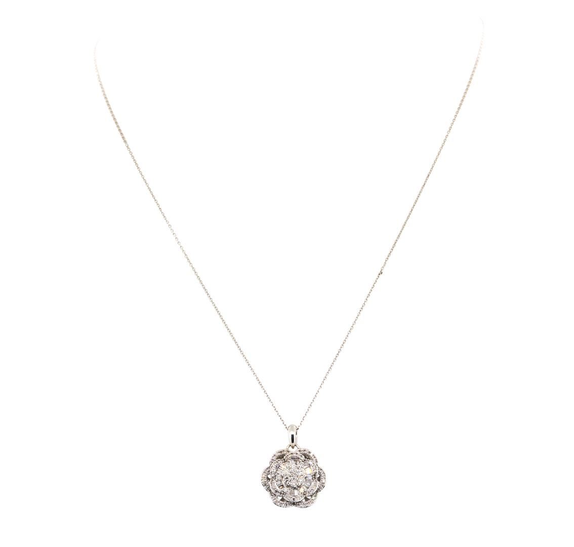 One floral motif pendant with an eighteen inch long 1mm diamond cut cable link chain that adjusts down to sixteen inches featuring: 14KT white gold weighing 5.0 grams containing diamonds weighing 1.00ctw.