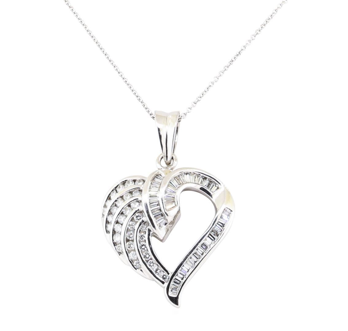 One heart shaped pendant with chain featuring: 14KT white gold weighing 5.6 grams containing diamonds weighing 1.00ctw. The chain is a 1mm rounded cable link chain measuring sixteen inches in length.