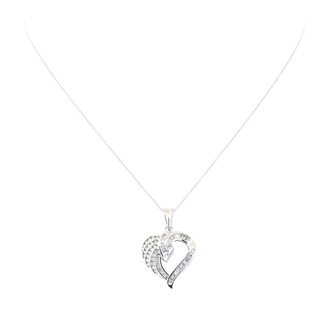 One heart shaped pendant with chain featuring: 14KT white gold weighing 5.6 grams containing diamonds weighing 1.00ctw. The chain is a 1mm rounded cable link chain measuring sixteen inches in length.