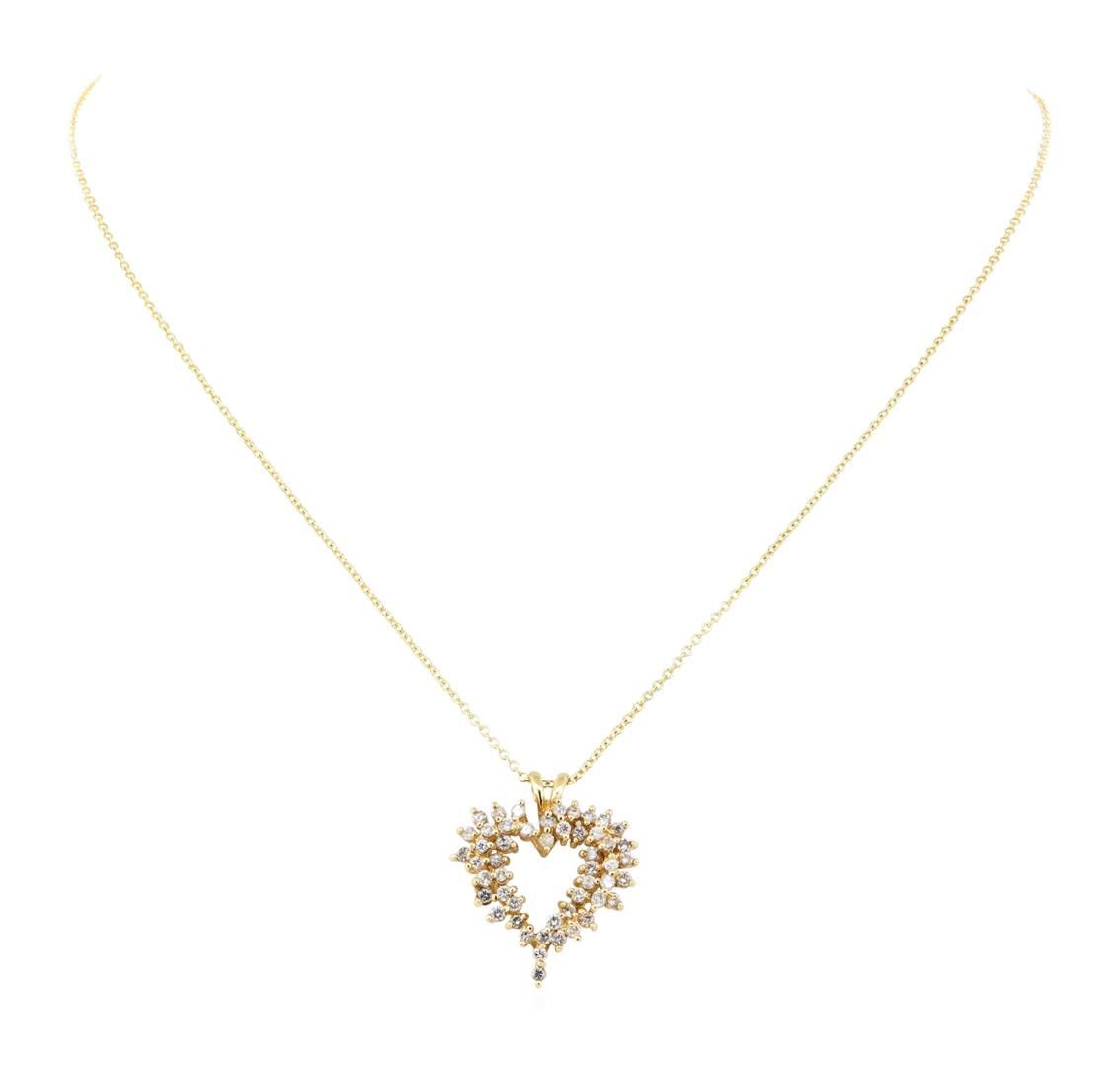 One heart shaped pendant with an attached 16 inch 1.3mm rounded cable link chain featuring: 14KT yellow gold weighing 5.5 grams containing diamonds weighing 1.00ctw.