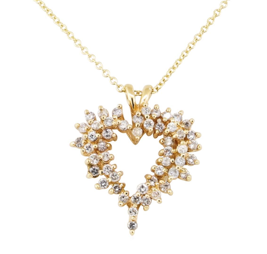 One heart shaped pendant with an attached 16 inch 1.3mm rounded cable link chain featuring: 14KT yellow gold weighing 5.5 grams containing diamonds weighing 1.00ctw.