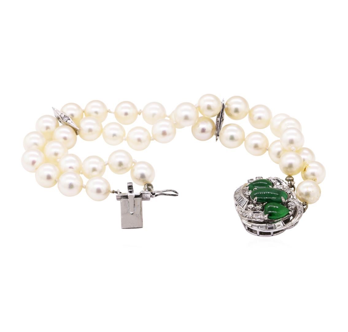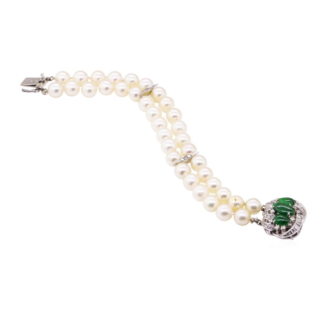 One lady's double strand pearl bracelet with a white gold clasp featuring: 18KT white gold weighing 29.2 grams containing diamonds weighing 1.00ctw, Akoya cultured pearls measuring 7.5-7.0mm in diameter and oval and pear shape cabochon cut jadeite. The bracelet measures approximately six and a half inches in length.
