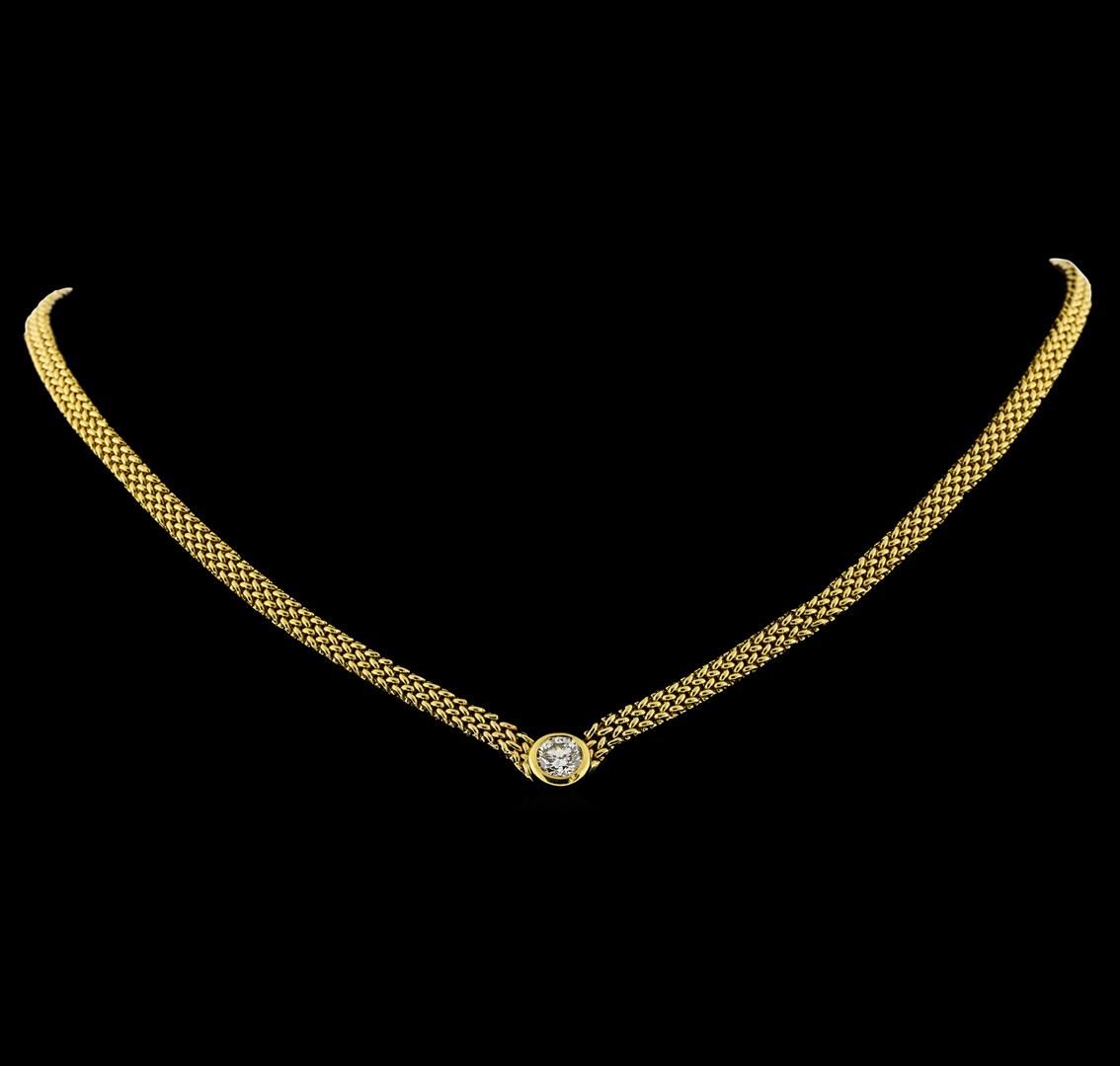 One electronically tested 14KT yellow gold lady's combination cast & assembled fashion solitaire necklace with a tongue clasp with foldover safety with a bright polish finish. The featured lady's necklace has a 4.40mm thick basket weave chain measuring approximately 17 inches long. Condition is like new, good workmanship. Containing: One bezel set round brilliant cut diamond, measuring 6.30 - 6.25 x 3.86mm (depth est.) , 5.00.%. GTCF approximate weight of 1.00ct. Graded in the setting. Clarity I-1. Color: H - I Cut Very Good. Total Weight of Diamonds 1.00ct.. Total Weight of Necklace 23.40gm. GAS Appraised at $11,285.00.