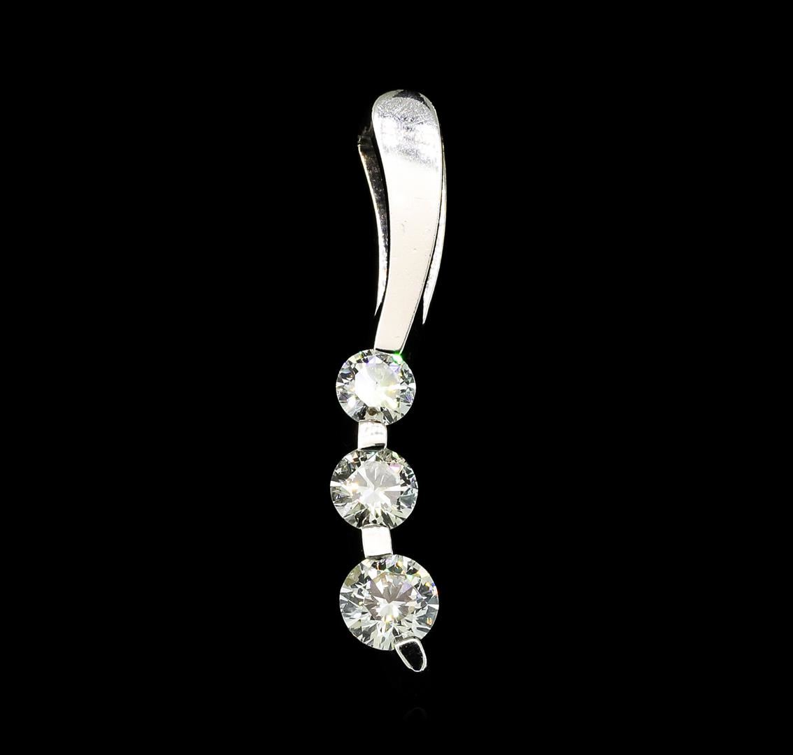 One electronically tested 14KT white gold ladies cast diamond pendant. The pendant features three diamonds set within a vertical white gold curve, completed by a hidden bail. Bright polish finish. Trademark is GUILD. Identified with markings of '14K'. Condition is good. Containing: Three tension set round brilliant cut diamonds approximate total weight of 3 Stones = 1.00ct. Graded in the setting. Clarity I-1 to I-2. Color: G - I. Total Weight of Diamonds 1.00ct.. Total Weight of Pendant 3.16gm. AIG Appraised at $4,020.00.
