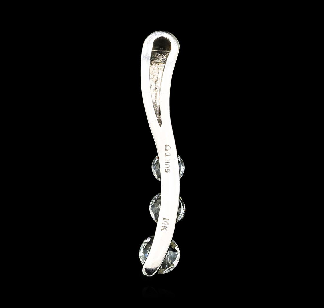 One electronically tested 14KT white gold ladies cast diamond pendant. The pendant features three diamonds set within a vertical white gold curve, completed by a hidden bail. Bright polish finish. Trademark is GUILD. Identified with markings of '14K'. Condition is good. Containing: Three tension set round brilliant cut diamonds approximate total weight of 3 Stones = 1.00ct. Graded in the setting. Clarity I-1 to I-2. Color: G - I. Total Weight of Diamonds 1.00ct.. Total Weight of Pendant 3.16gm. AIG Appraised at $4,020.00.