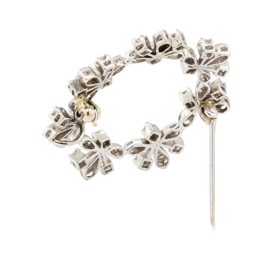 One electronically tested 14KT white gold lady's combination cast & assembled fashion pendant-pin with a wreath motif with a bright polish with milgrain detailing finish. Identified with markings of '14K'. Condition is used, good workmanship. Containing: Twenty-One prong set round brilliant cut diamonds, measuring 2.10 - 2.05 x 1.29mm (depth est.) approximate total weight of 21 Stones = 0.70ct. Graded in the setting. Color G - I Clarity VS-2 to SI-2 Cut Good Forty-Two prong set single cut diamonds, measuring 1.40 - 1.10 x 0.78mm (depth est.) approximate total weight of 42 Stones = 0.30ct. Graded in the setting. Color H - I Clarity VS-1 to VS-2 Cut Good. Total Weight of Diamonds 1.00ct.. Total Weight of Pendant-Pin 5.90gm GAS Appraised at $3405.00. GAS Appraised at $3,405.00.