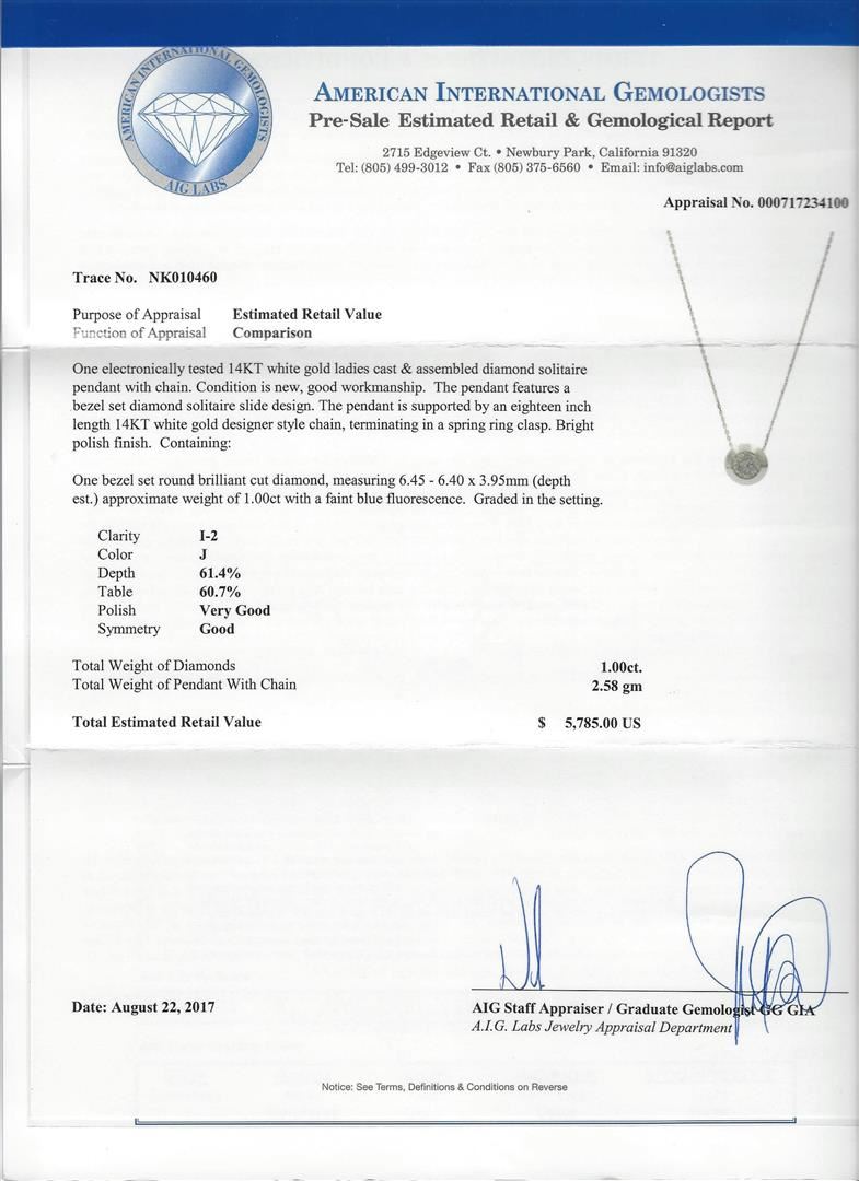One 1.00ct Diamond Pendant With Chain - 14KT White Gold. AIG certified. See Appraisal for more details. AIG Appraised.