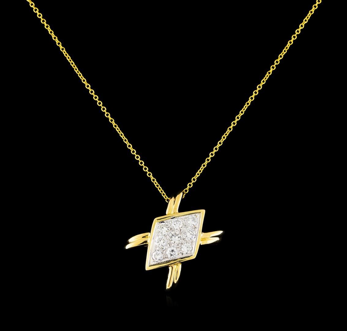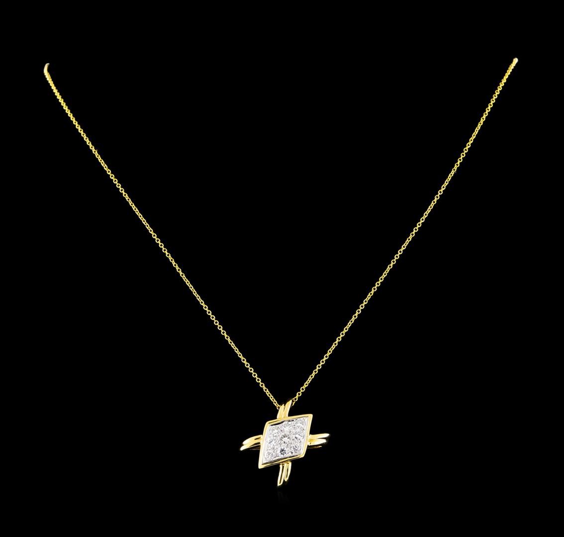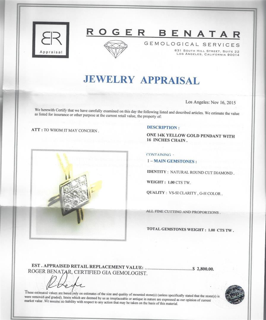 One 14K yellow gold pendant with 16 inches chain. Main gemstones: Identity: Natural round cut diamond. Weight: 1.00 CTS TW. Quality: VS-SI clarity, G-H color. All fine cutting and proportions. Total gemstones weight: 1.00 CTS TW. RBGS Appraised at $2,800.00.