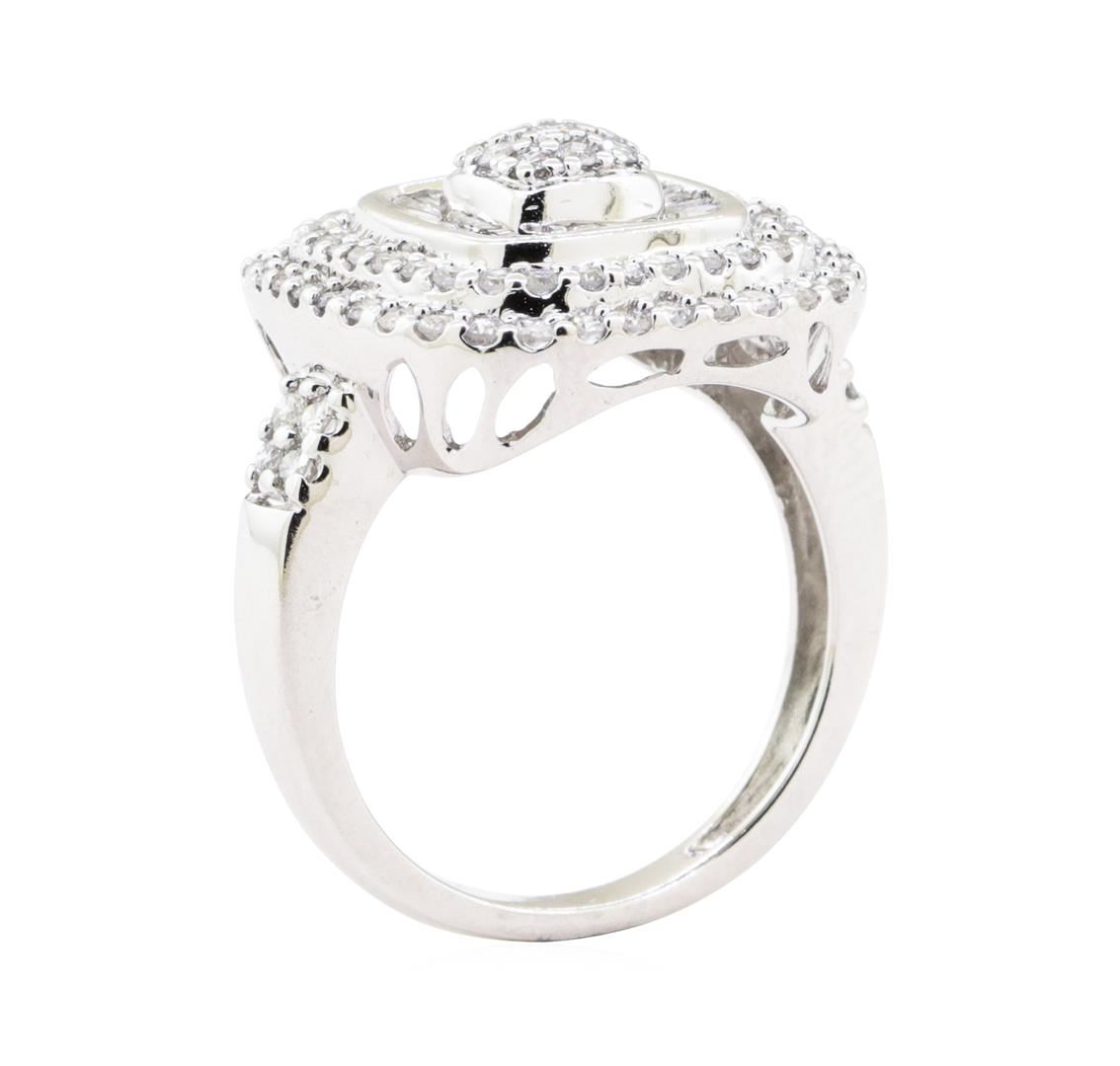 One cushion halo ring featuring: 10KT white gold weighing 4.8 grams containing diamonds weighing 1.00ctw.