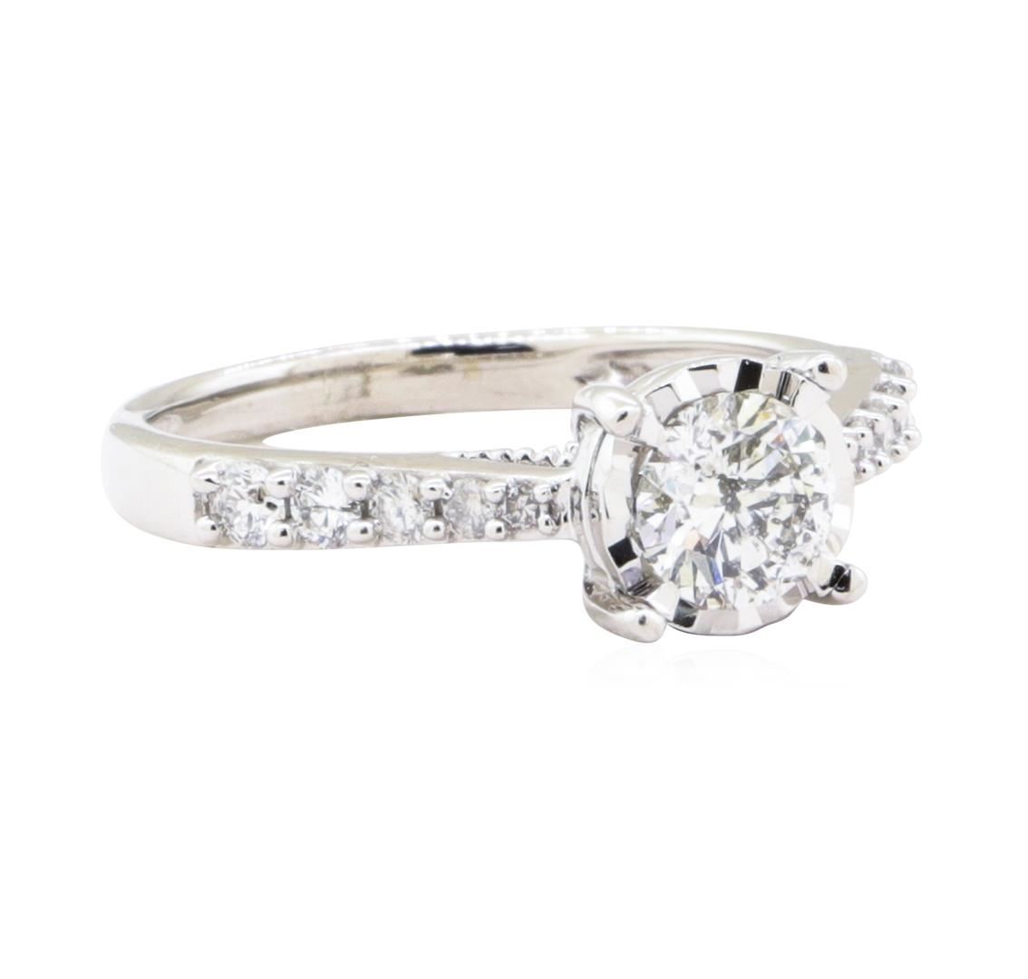 One electronically tested 10KT white gold lady's combination cast & assembled fashion ring with a cathedral solitaire with a bright polish finish. The featured lady's ring has a shank measuring 2.00 millimeters wide. Identified with markings of '10K'. Condition is Good. Containing: One prong set round brilliant cut diamond, measuring 5.71 - 5.69 x 3.53mm (depth est.) , 3.00.%. GTCF approximate weight of 0.73ct. Graded in the setting. Color H Clarity I-1 Cut Very Good Eight prong set round brilliant cut diamonds, measuring 2.40 - 1.60 x 1.24mm (depth est.) approximate total weight of 8 Stones = 0.25ct. Graded in the setting. Color H - I Clarity SI-2 to I-1 Cut Good Two prong set single cut diamonds, measuring 1.25 - 1.25 x 0.78mm (depth est.) approximate total weight of 2 Stones = 0.02ct. Graded in the setting. Color H - I Clarity SI-2 Cut Good. Total Weight of Diamonds 1.00 ct.. Total Weight of Ring 3.00gm GAS Appraised at $5110.00. GAS Appraised.