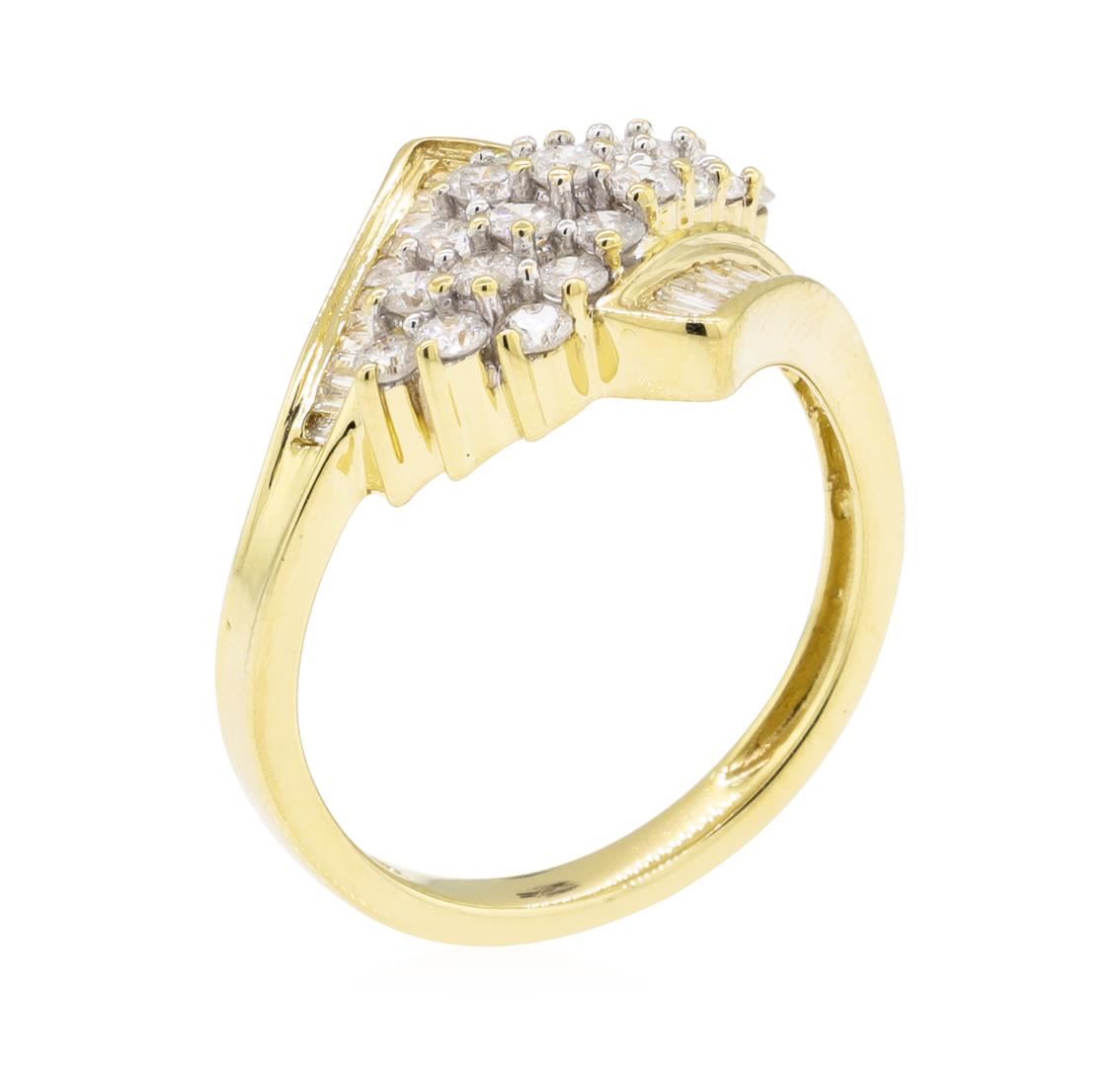 One electronically tested 10KT yellow gold lady's cast fashion cluster ring with a bypass shank with a bright polish finish. The featured lady's ring has a shank measuring 2.50 millimeters wide. Condition is like new, good workmanship. Containing: Twenty-One prong set round brilliant cut diamonds, measuring 2.20 - 2.10 x 1.33mm (depth est.) approximate total weight of 21 Stones = 0.80ct. Graded in the setting. Color G - H Clarity I-1 to I-2 Cut Good Twenty-Four channel set baguette cut (tapered) diamonds, measuring from 1.30 x 0.80 x 0.68mm (depth est.) to 1.80 x 1.40 x 1.19mm (depth est.) approximate total weight of 24 Stones = 0.20ct. Graded in the setting. Color G - H Clarity SI-2 to I-1 Cut Good. Total Weight of Diamonds 1.00ct.. Total Weight of Ring 3.80gm GAS Appraised at $2050.00. GAS Appraised at $2,050.00.