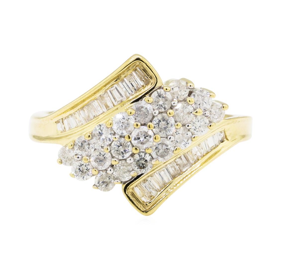 One electronically tested 10KT yellow gold lady's cast fashion cluster ring with a bypass shank with a bright polish finish. The featured lady's ring has a shank measuring 2.50 millimeters wide. Condition is like new, good workmanship. Containing: Twenty-One prong set round brilliant cut diamonds, measuring 2.20 - 2.10 x 1.33mm (depth est.) approximate total weight of 21 Stones = 0.80ct. Graded in the setting. Color G - H Clarity I-1 to I-2 Cut Good Twenty-Four channel set baguette cut (tapered) diamonds, measuring from 1.30 x 0.80 x 0.68mm (depth est.) to 1.80 x 1.40 x 1.19mm (depth est.) approximate total weight of 24 Stones = 0.20ct. Graded in the setting. Color G - H Clarity SI-2 to I-1 Cut Good. Total Weight of Diamonds 1.00ct.. Total Weight of Ring 3.80gm GAS Appraised at $2050.00. GAS Appraised at $2,050.00.