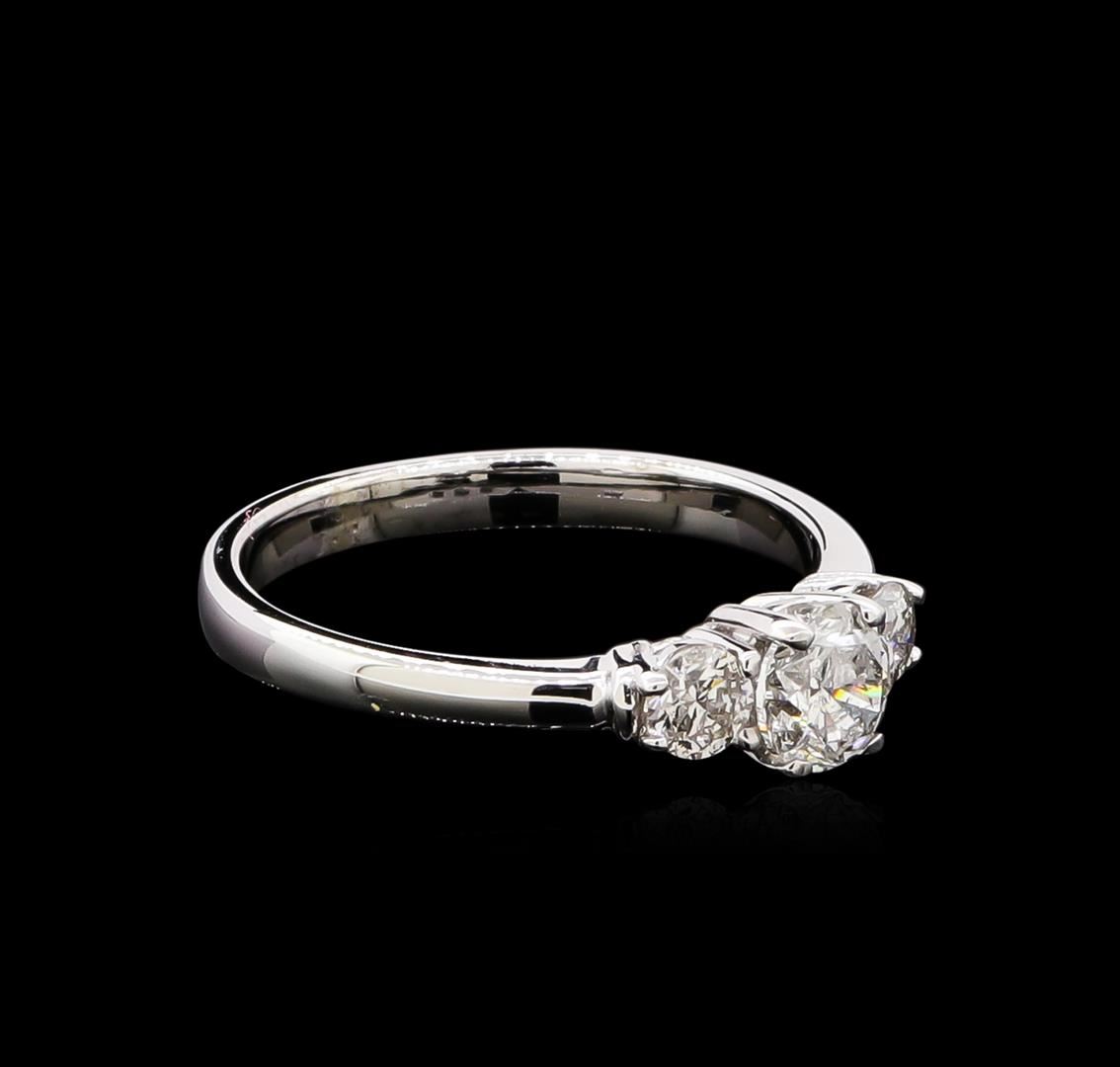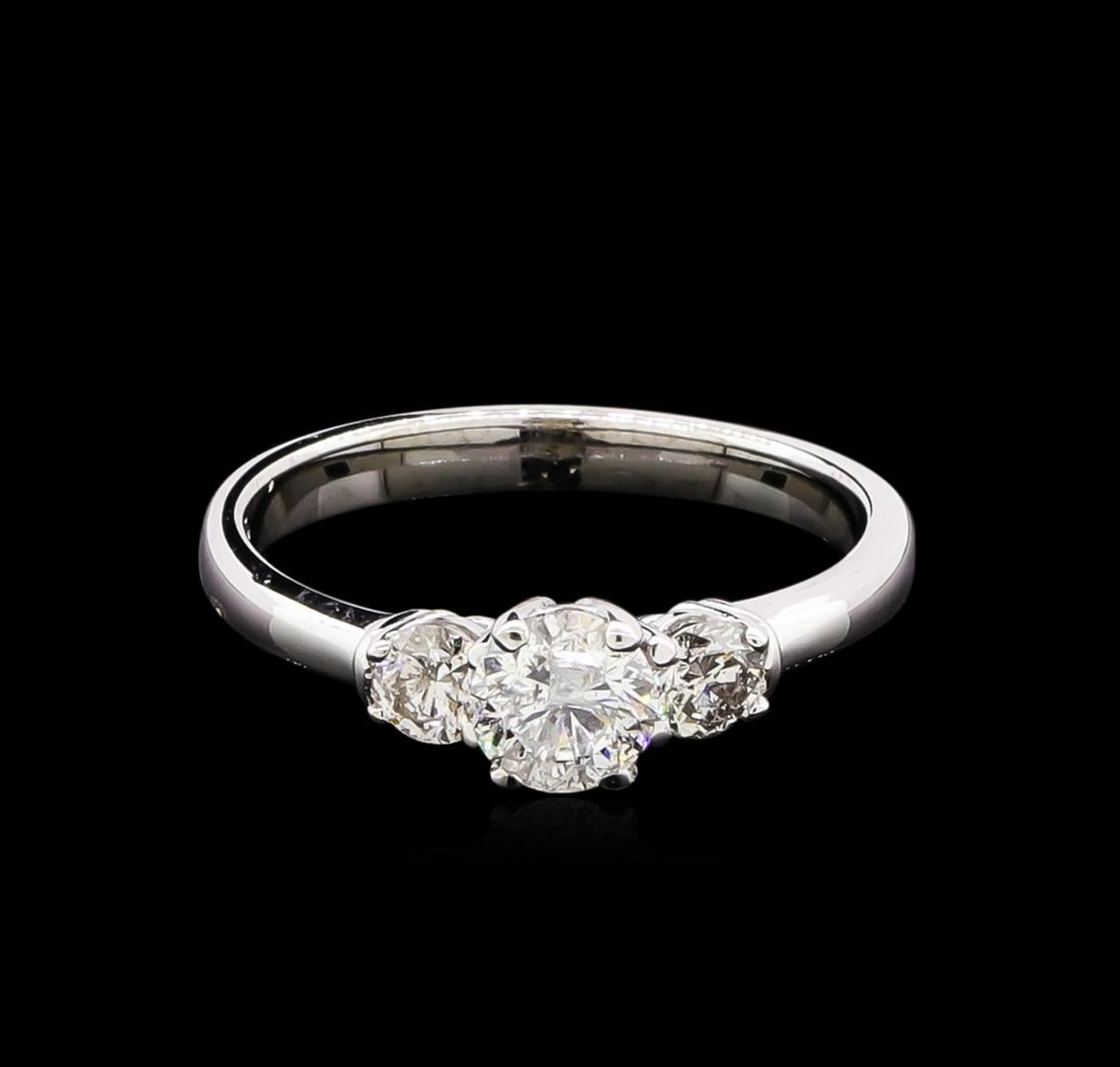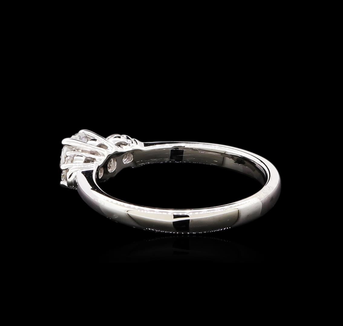 One electronically tested 14KT white gold ladies cast three diamond ring with a bright polish finish. The ring features a three round brilliant diamond series, completed by a two and one-half millimeter wide band. Identified with markings of "14K". Condition is new, good workmanship. Containing: One prong set round brilliant cut diamond, measuring 5.25 - 5.23 x 3.34mm (depth est.), 6.00.%. GTCF approximate weight of 0.63ct. Graded in the setting. Clarity: I-1. Color: 63.7%. Table 61.1%. Two prong set round brilliant cut diamonds, measuring 3.50 - 3.45 x 2.10mm (depth est.) approximate total weight of 2 Stones = 0.37ct. Graded in the setting. Clarity: I-1. Color: G. Total Weight of Diamonds 1.00ct. Total Weight of Ring 3.05gm. AIG Appraised at $5,070.00.