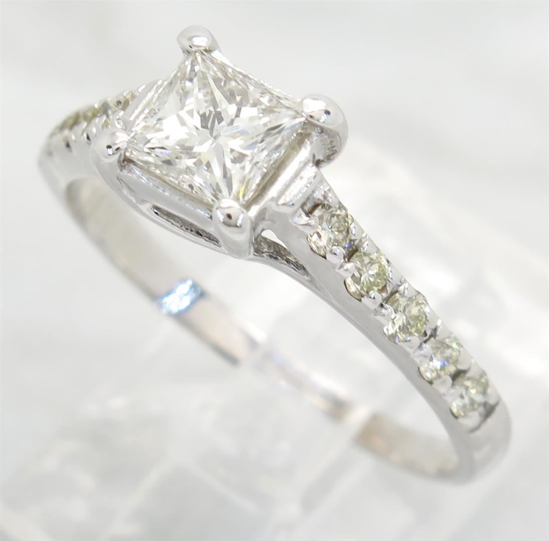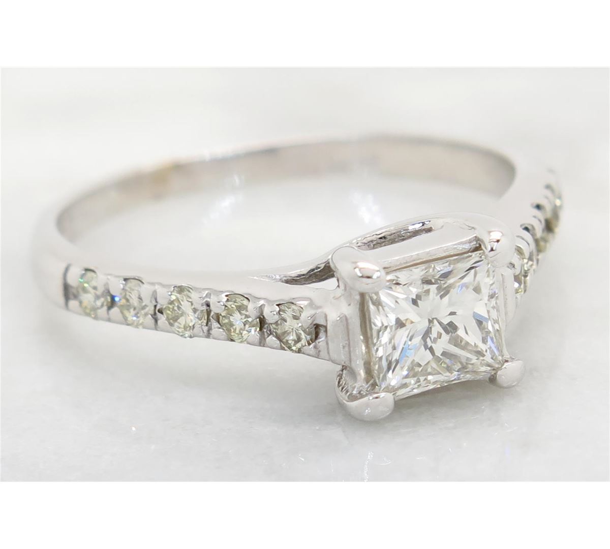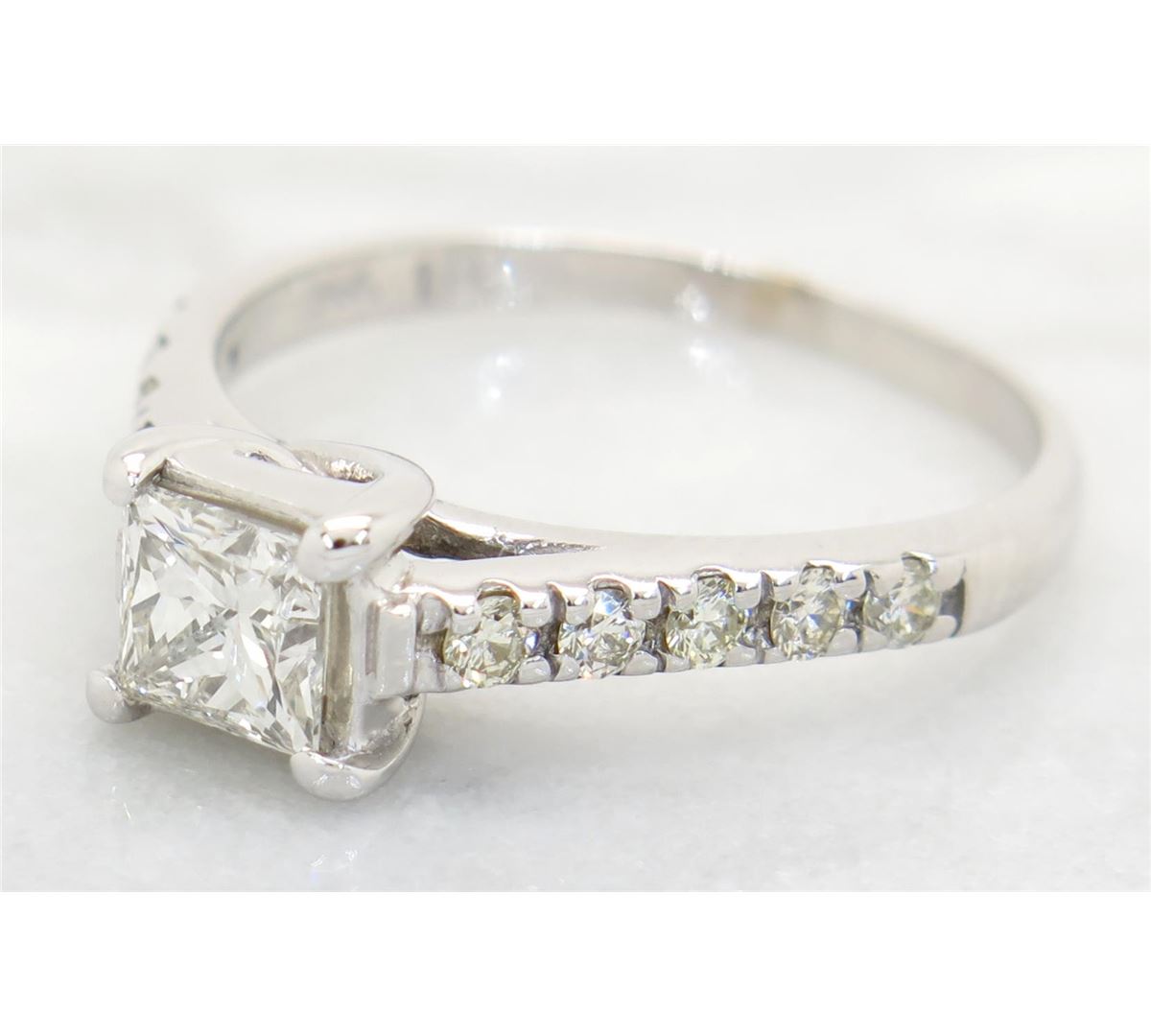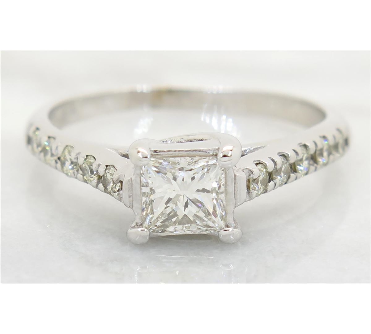 One tested 14K white gold diamond ring. Containing: One Princess Cut Diamond. Approximate Size: .70CT. Clarity: SI2, Color: G-H. 10 Round Brilliant Cut Diamonds. Approximate total diamond weight: 1.00CTW. All diamonds are graded in the mounting unless otherwise stated. Weight of ring: 2.9 grams, Size: 7.25