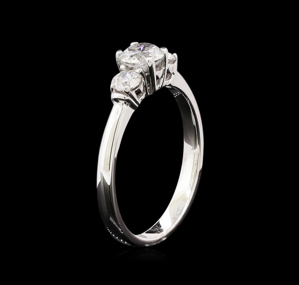 One electronically tested 14KT white gold ladies cast three diamond ring with a bright polish finish. The ring features a three round brilliant diamond series, completed by a two and one-half millimeter wide band. Identified with markings of "14K". Condition is new, good workmanship. Containing: One prong set round brilliant cut diamond, measuring 5.25 - 5.23 x 3.34mm (depth est.), 6.00.%. GTCF approximate weight of 0.63ct. Graded in the setting. Clarity: I-1. Color: 63.7%. Table 61.1%. Two prong set round brilliant cut diamonds, measuring 3.50 - 3.45 x 2.10mm (depth est.) approximate total weight of 2 Stones = 0.37ct. Graded in the setting. Clarity: I-1. Color: G. Total Weight of Diamonds 1.00ct. Total Weight of Ring 3.05gm. AIG Appraised at $5,070.00.