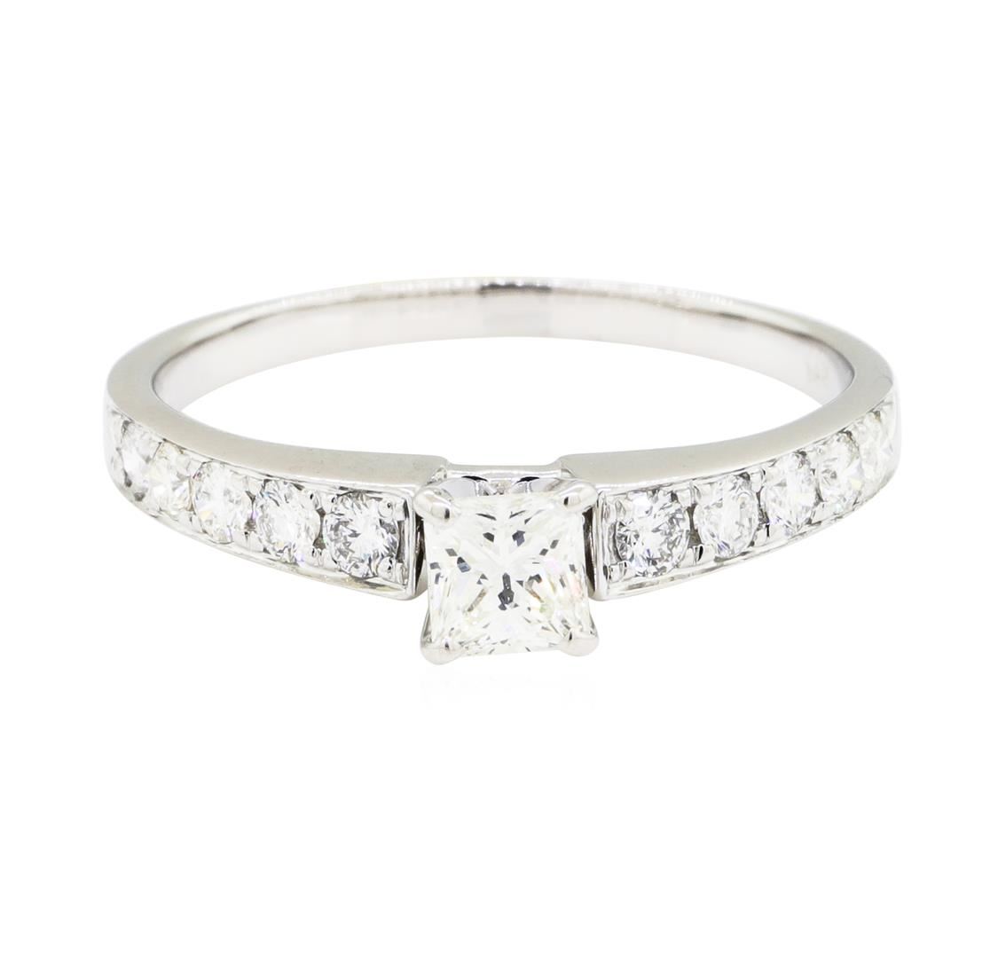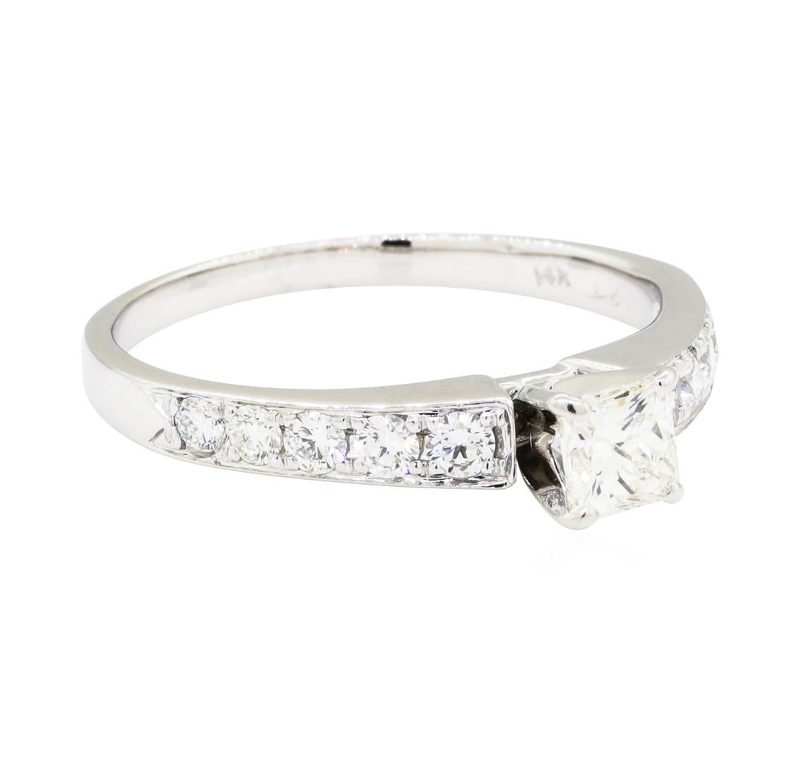 One electronically tested 14KT white gold lady's combination cast & assembled straight line engagement ring with a cathedral shank with a bright polish finish. The featured lady's ring has a shank measuring 1.80 millimeters wide. Identified with markings of '14K'. Condition is like new, good workmanship. Containing: One prong set princess cut diamond, measuring 4.25 x 4.21 x 3.16mm (depth est.) approximate weight of 0.47ct. Graded in the setting. Color I Clarity SI-1 Cut Excellent Ten bead set round brilliant cut diamonds, measuring 2.50 - 2.30 x 1.49mm (depth est.) approximate total weight of 10 Stones = 0.53ct. Graded in the setting. Color H - I Clarity VS-2 to SI-1 Cut Very Good. Total Weight of Diamonds 1.00ct.. Total Weight of Ring 3.20gm GAS Appraised at $3650.00. GAS Appraised at $3,650.00.