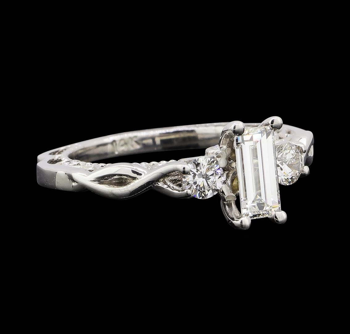 One electronically tested 14KT white gold lady's cast wedding ring with a twisted cathedral shank with a bright polish with milgrain detailing finish. The featured lady's ring has a shank measuring 1.82 millimeters wide. Identified with markings of '14K'. Condition is new, good workmanship. Containing: One prong set baguette cut diamond, measuring 7.02 x 3.48 x 2.45mm (depth est.) , 10.00.%. GTCF approximate weight of 0.61ct. Graded in the setting. Clarity VS-1. Color: H Cut Very Good Two prong set round brilliant cut diamonds, measuring 3.30 - 3.25 x 2.03mm (depth est.) approximate total weight of 2 Stones = 0.27ct. Graded in the setting. Clarity SI-1 to SI-2. Color: G - H Cut Very Good Six bezel set round brilliant cut diamonds, measuring 2.00 - 1.50 x 1.08mm (depth est.) approximate total weight of 6 Stones = 0.12ct. Graded in the setting. Clarity SI-1 to SI-2. Color: H - I Cut Very Good. Total Weight of Diamonds 1.00ct.. Total Weight of Ring 3.70gm. GAS Appraised at $5,245.00.