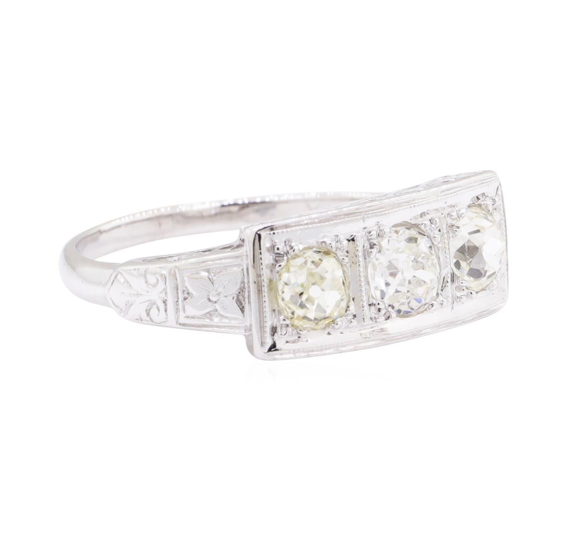 One electronically tested 14KT white gold lady's cast three stone straight line ring with a tapered shank with a bright polish with milgrain detailing finish. The featured lady's ring has a vintage motif and a shank measuring 1.65 millimeters wide. Identified with markings of '14K'. Condition is new, good workmanship. Containing: Three prong set old mine cut diamonds, measuring 4.45 - 4.04 x 2.64mm (depth est.) , 10.00.%. GTCF approximate total weight of 3 Stones = 1.00ct. Graded in the setting. Color J - L Clarity VS-1 to VS-2 Cut Good. Total Weight of Diamonds 1.00ct.. Total Weight of Ring 3.10gm GAS Appraised at $3145.00. GAS Appraised at $3,145.00.